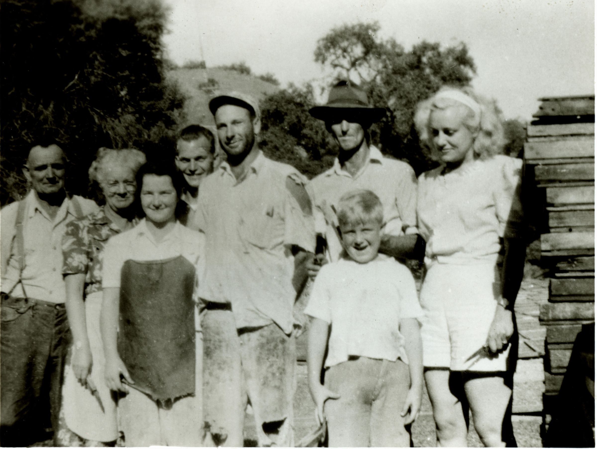 Gathered at the McKinley ranch on upper Shannon Road in 1947 are, from left to right: Johnny and Pearl Panighetti, Vera McKinley and Norman Handley, Lester Fink, Mike McKinley, and Alice Fink. Lester Fink drove the local school bus for 26 years. Ron Fink, the boy who stands in front, has managed the Macabee Gopher Trap Company in Los Gatos for more than 40 years. The Finks had come over to the McKinley ranch to help "cut 'cots," because theirs were done. FIN031aCollection