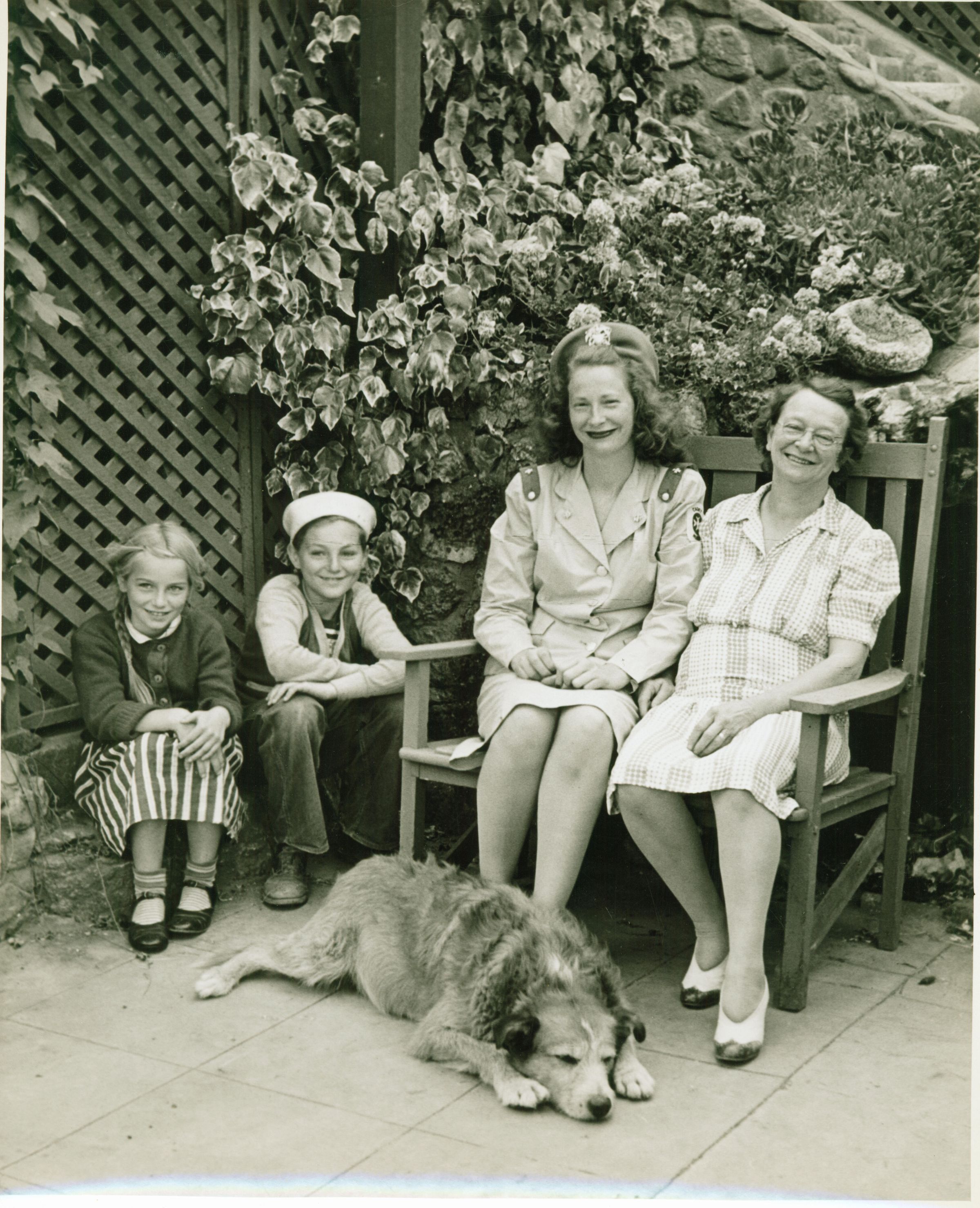 Family group is, left to right, Joan and Russell Spear (niece and nephew of Jackie Behrens), Jeanne Behrens (a Cadet Nurse, one of Jackie's six sisters), and Mother Behrens. Chief relaxes in the foreground. CHF001Collection