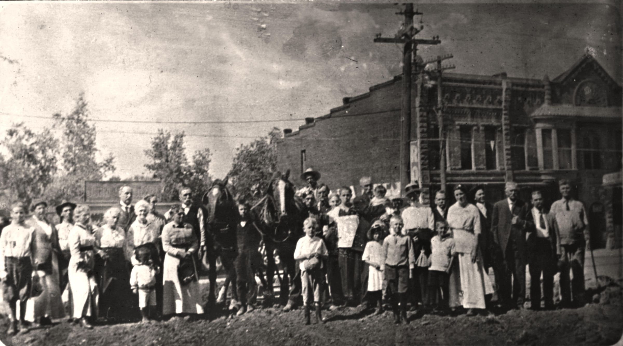 Black and white photograph of congregation on site of First Baptist Church on East Main Street and Wilcox (College) Avenue. In the photo, the congregation gathers for groundbreaking at the church site in 1916. Handwriting on the back of the photograph gives the following information, with "Mrs. P. O. Dickinson" listed twice: Left to right: Cecil Dickinson, Mrs. P.O. Dickinson, Axel Anderson, Mrs Wagner, Mrs. H. Dickinson, the Rev. N.L. Freeman, Mrs. Wheeler, ( little Howard boy in front ), Mrs. N. L. Freeman, Mrs. Joy, Mrs. P.O. Dickinson, horses, Hubble boy between horses, Arthur Wagner, Mary Steel and two Howard boys. Adults on the right by the horses, unknown, Mr. Van L. Suggs, Mrs. David Matheson, Ina Matheson, Mr. Wheeler ( with grandchild in arms ), Ruth Nailman, Mrs. Steel, the Rev. Jepson, Mrs. Howard, the Rev. Troxel, A. C. Covert, man unknown, and Mr. Allison. CH008Collection