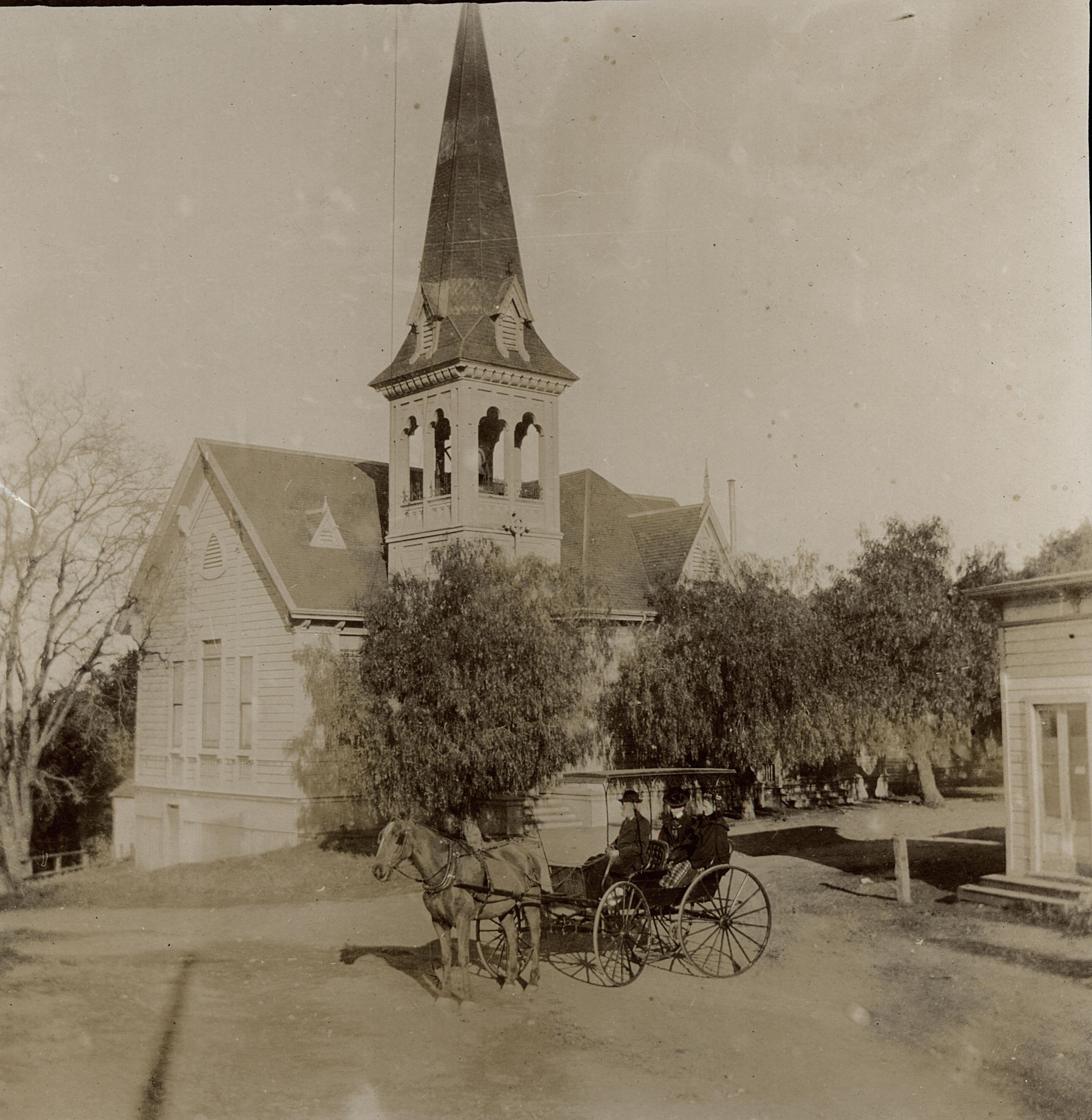 Church Street, near Forbes Mill. The Presbyterian Church was founded in Los Gatos in 1881. The Church held services in Lyndon Hall until the McMillan home, just above Forbes Mill, was converted to a small chapel. A Sunday School commenced on July 17, 1881. This church was dedicated on May 5, 1885. It cost $5,000, including furniture, organ, chairs, carpets, chandelier, fence and sheds. During the period of 1937 - 1939, the original church was modernized. The decaying steeple was removed and the opera seats were replaced with pews. The membership grew, and in 1948, a five acre tract on Shannon Road was purchased for $7,500. A Fellowship Hall was constructed first and dedicated in 1953. It served as a sanctuary until the new sanctuary was completed and dedicated in 1958. CH023Collection