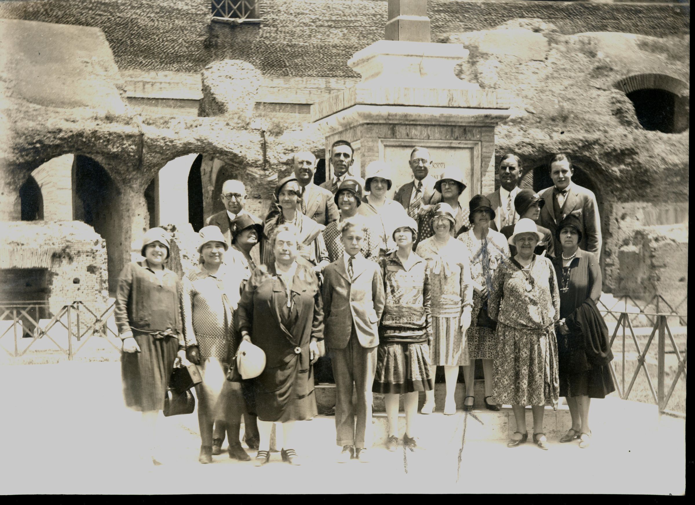 Jean Cilker is seen in the second row at left -"hiding under her hat." Jean had a great sense of adventure and traveled widely. This was an American Express tour of Rome, Italy, circa 1930. CLK023Collection
