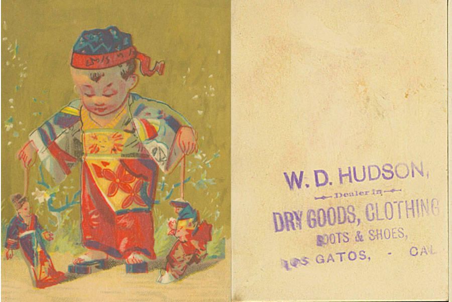 The flyer shows a Japanese child, in kimono and geta, playing with two puppets. The advertisement for W.D. Hudson, a dealer in dry goods, clothing, boots & shoes, is stamped on the card. Hudson's store was on Main Street. AD029Collection