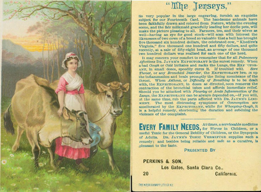 An advertisement for Dr. Jayne's Expectorant and Dr. Jayne's Tonic Vermifuge, that can presumably be purchased at Perkins & Son's. The flyer also features a picture of a milkmaid with two Jersey cows, with information about the desirability of the breed. This is apparently a card from a series, being the fourteenth. Perkins & Son are found in the 1887-88 Los Gatos city directory operating a hardware store on Main Street. Palmer Perkins served as the first mayor of Los Gatos when the Town incorporated in 1887. In the 1895-96 directory, the son (F.W.) is listed, along with Mrs. A.C. Perkins, as owners of a hardware store on Main near University. AD027Collection