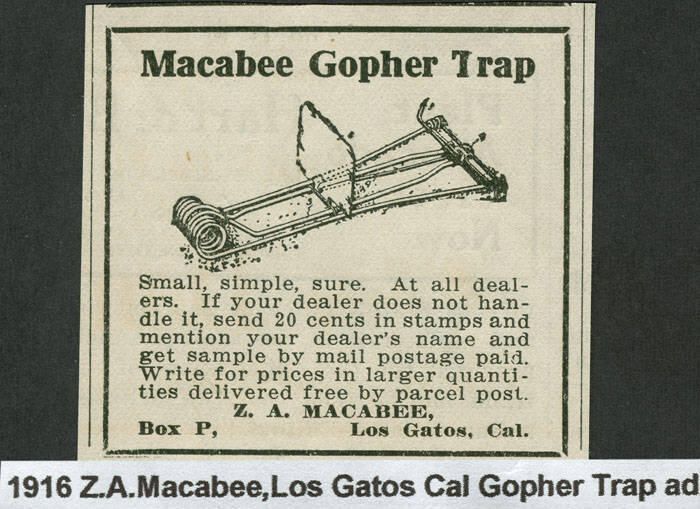 Flyer advertising Macabee Gopher Trap company in Los Gatos, with mail address and details for buying by mail. AD013Collection