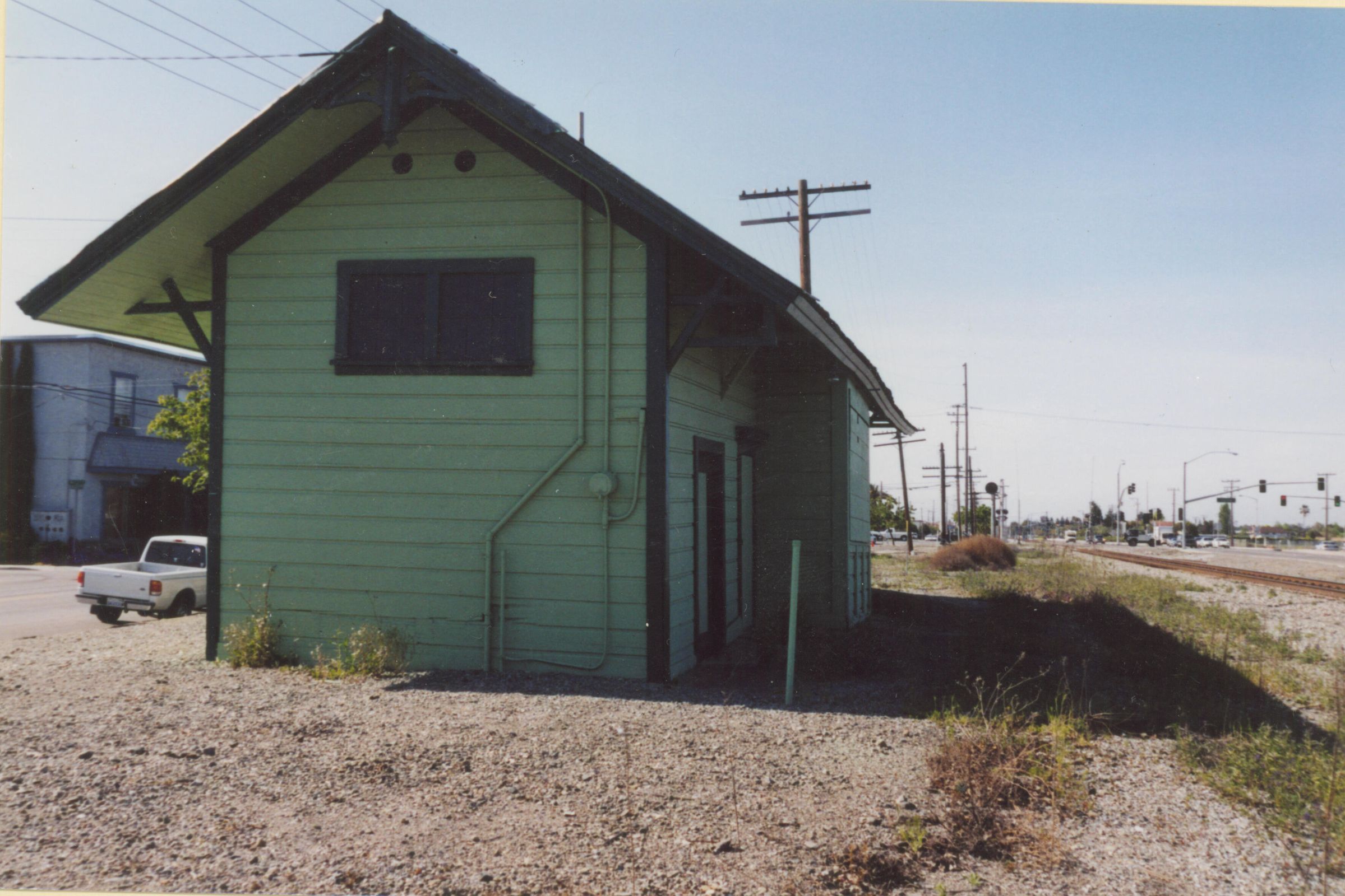 A view the south showing the Agnew train depot once used by South Pacific Coast Railroad (S.P.C.) and Southern Pacific (S.P.) railroads. Trains no longer stop here. LEI022Collection