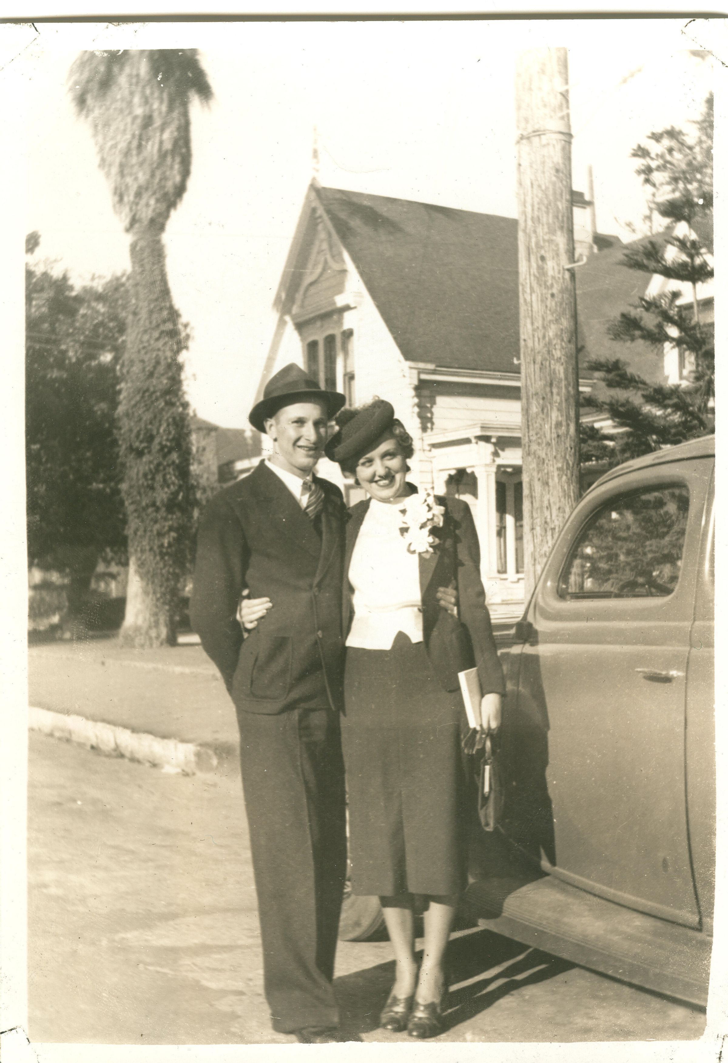 Alice (Scott) and Lester Fink on their wedding day, November 13, 1938. They are pictured in front of the preacher's house in Santa Cruz. FIN054Collection