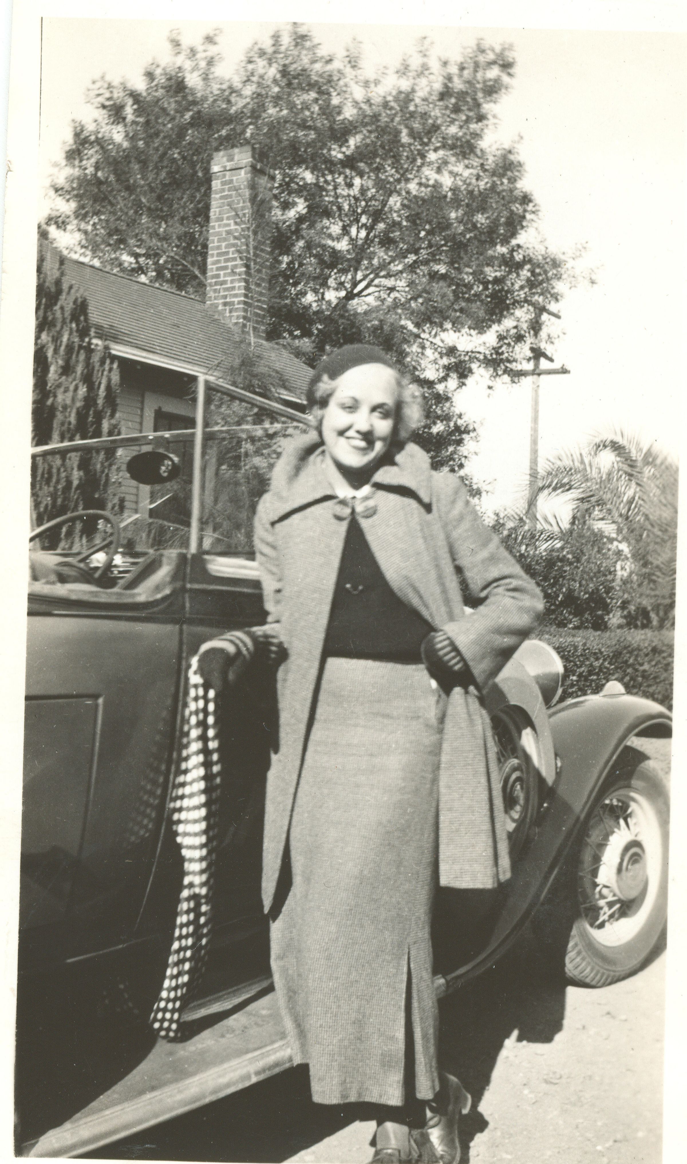 Alice Fink posed by a roadster, looking like the movie star Jean Harlow. Born in Los Gatos in 1919, Alice excells at art. She is fifth generation in the Santa Clara Valley, and has seen tremendous change in her lifetime. FIN045Collection