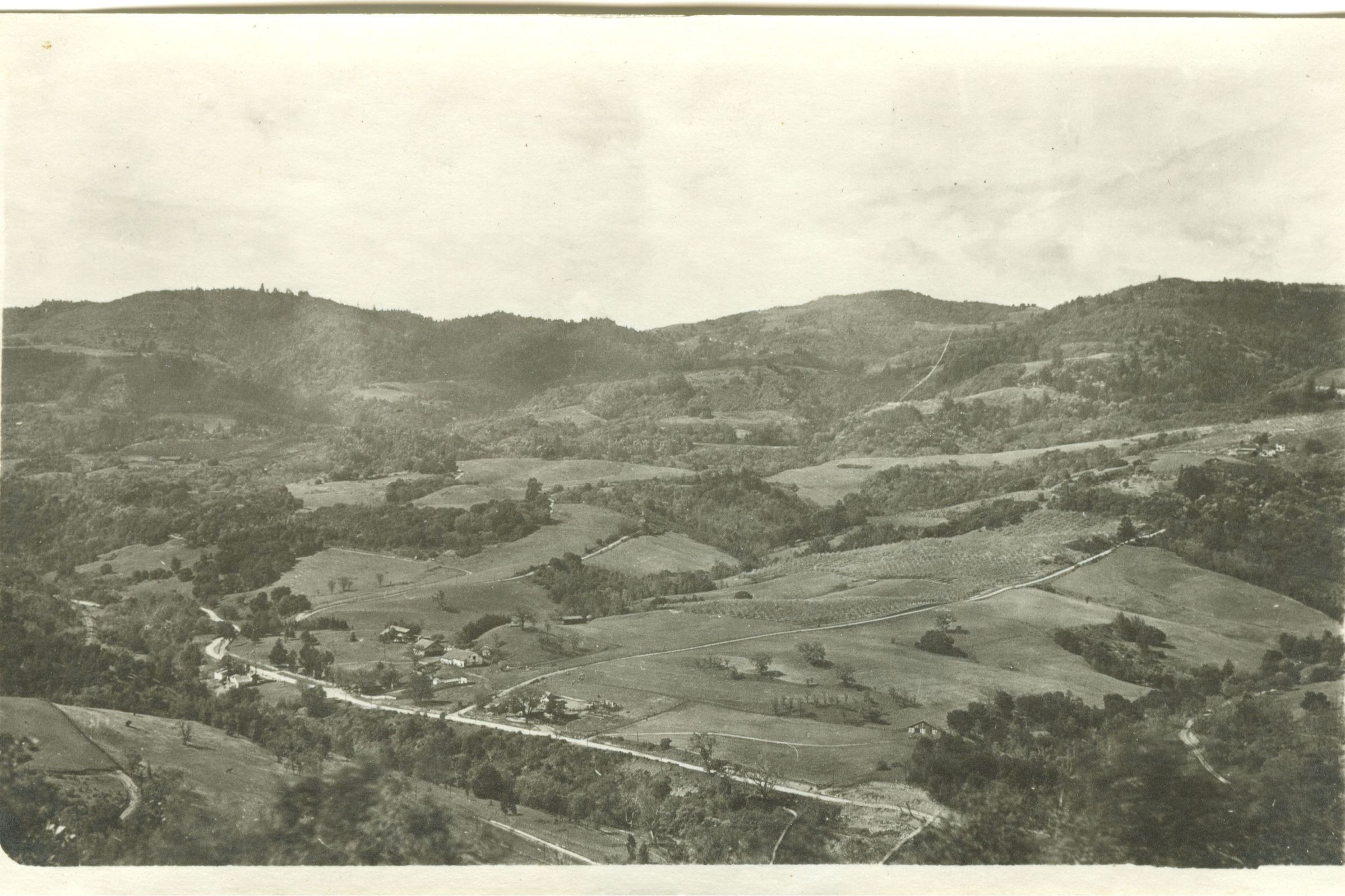 A view of Alma from the Novitiate. Black Road is in the foreground; Bear Creek Road is going up the hill. Bear Creek Road was formerly Dougherty Road. Train tracks are in the lower center. NVC040Collection