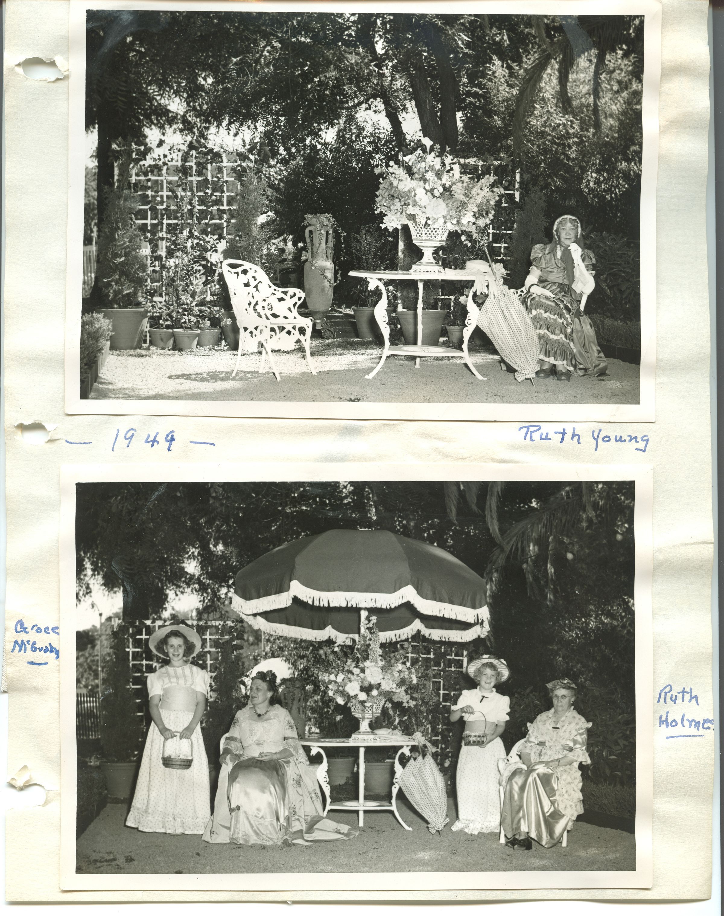 A photograph of the D.A.R.'s garden tableau, part of the California Centennial Celebration in Los Gatos. The woman of the photograph is identified as Ruth Young. (Ruth Comfort Mitchell Young). DAR022Collection