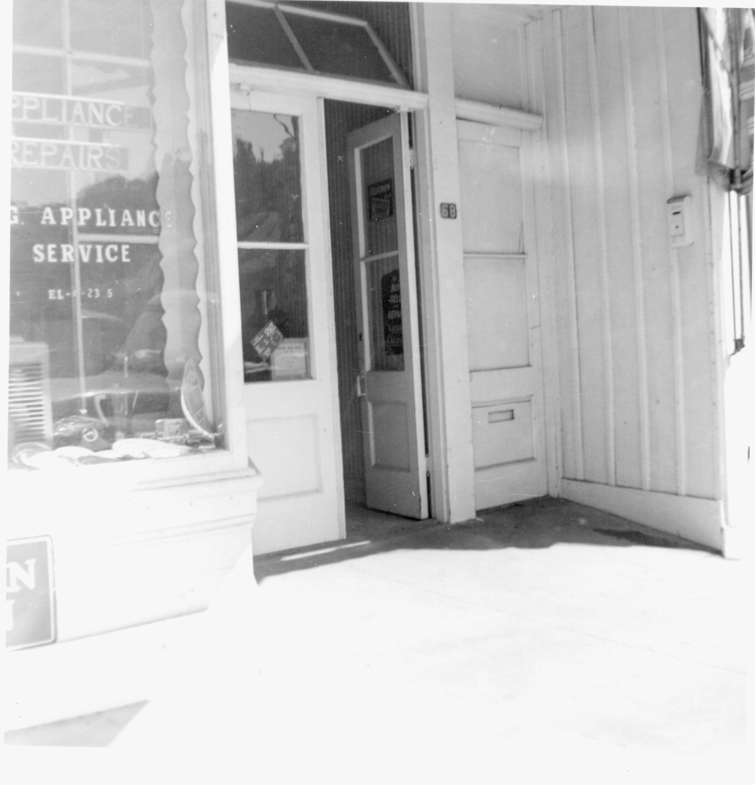 A 1950s Los Gatos appliance repairshop featured old-fashioned double doors from an earlier era. Lena Barbieri took a series of photographs around Los Gatos in 1954 with her little Brownie camera. She donated the snapshots to the Library in 2005. CON001Collection
