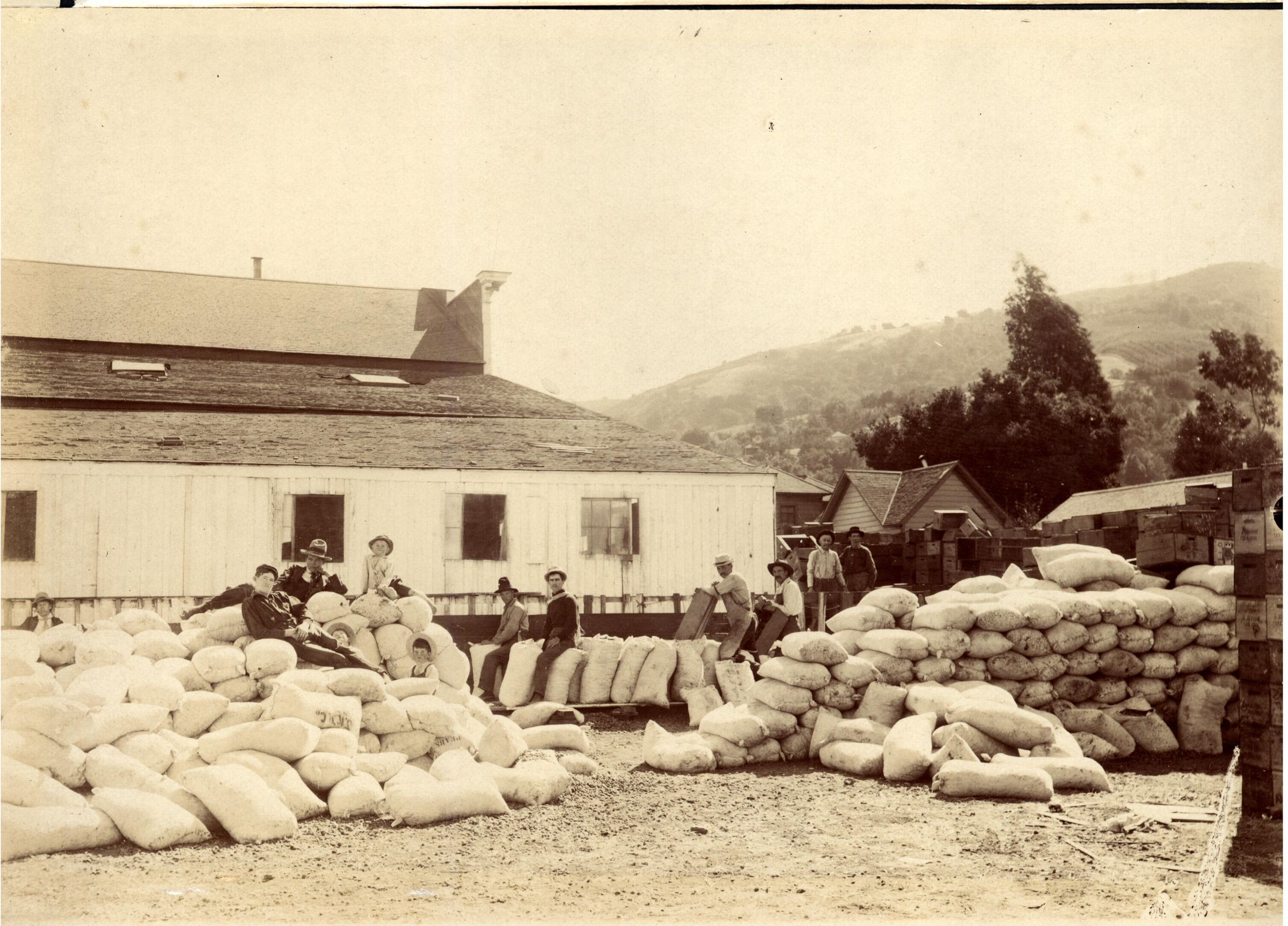 The apricot pit industry was located in the Vasona Park area and operated by the Sewell S. Brown Company. Apricot pits were dried in the open, then taken by a conveyor system into the plant for cracking. The kernels were sent to Europe, where they were used in the manufacture of almond and apricot kernel paste, which was used in cakes, candies, and cookies. In 1931, the apricot pit brought the grower as much money per ton as did the ripe fruit. AG017Collection