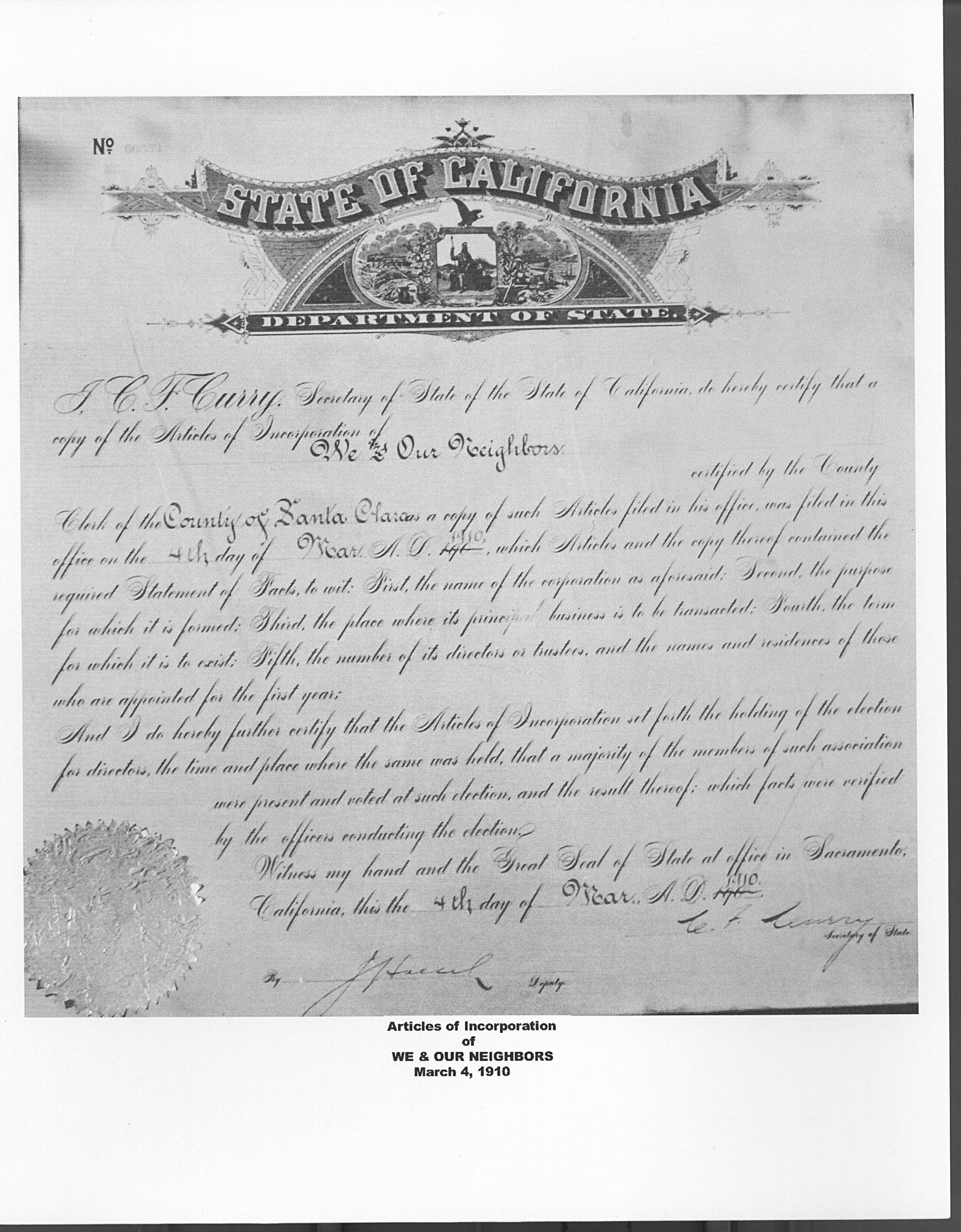 Articles of Incorporation awarded to the "We and Our Neighbors Club" from the California Secretary of State on March 4, 1910. The social club was founded in 1891 by five pioneer ranch women. The women arrived by horse and buggy to meet the third Saturday of each month. In 1910 the club constructed a new clubhouse at the corner of Union and Almaden Road. WE001Collection