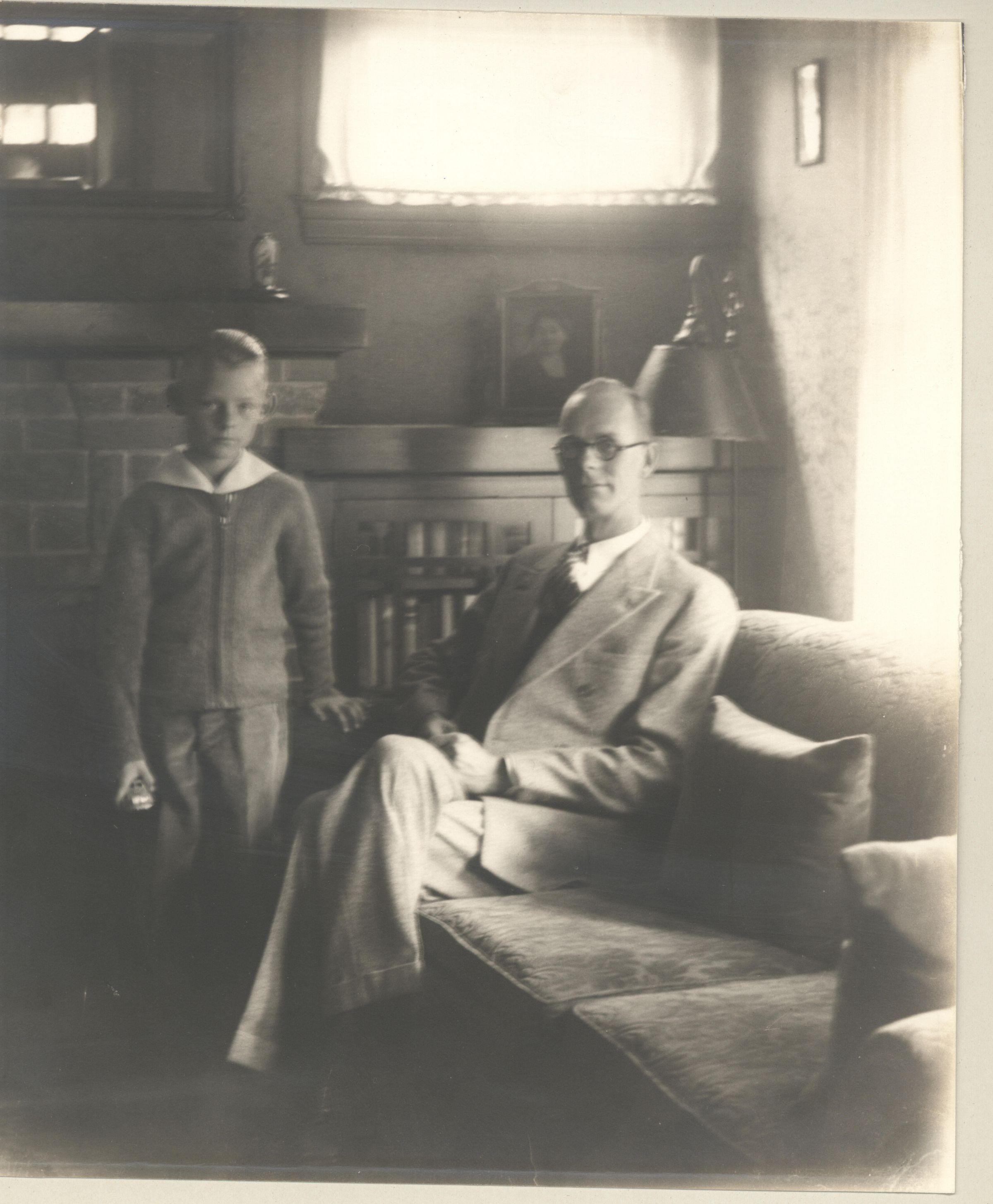 This is a rare interior shot taken at the Curtis family home at 106 Olive Street in Los Gatos. Paul Curtis, Sr. (1888-1965) is shown with his son, Paul, Jr. CUR040Collection