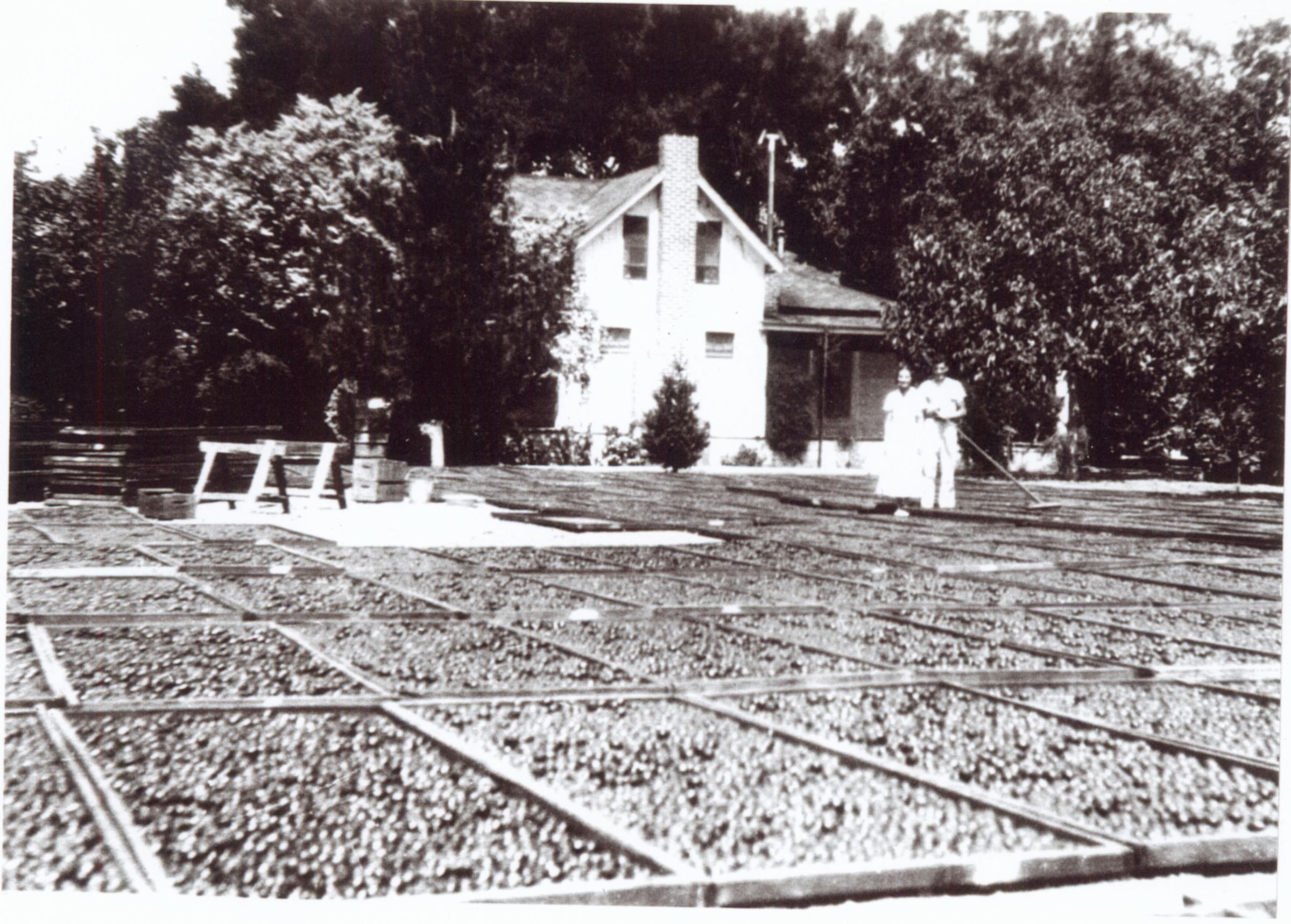 The Doetsch home is shown on the Vasona Junction farm. The house was on property now occupied by the Santa Clara County Fire Department on So. Winchester Ave. Standing near the drying trays are Cozetta and Frank Doetsch. DOE004Collection