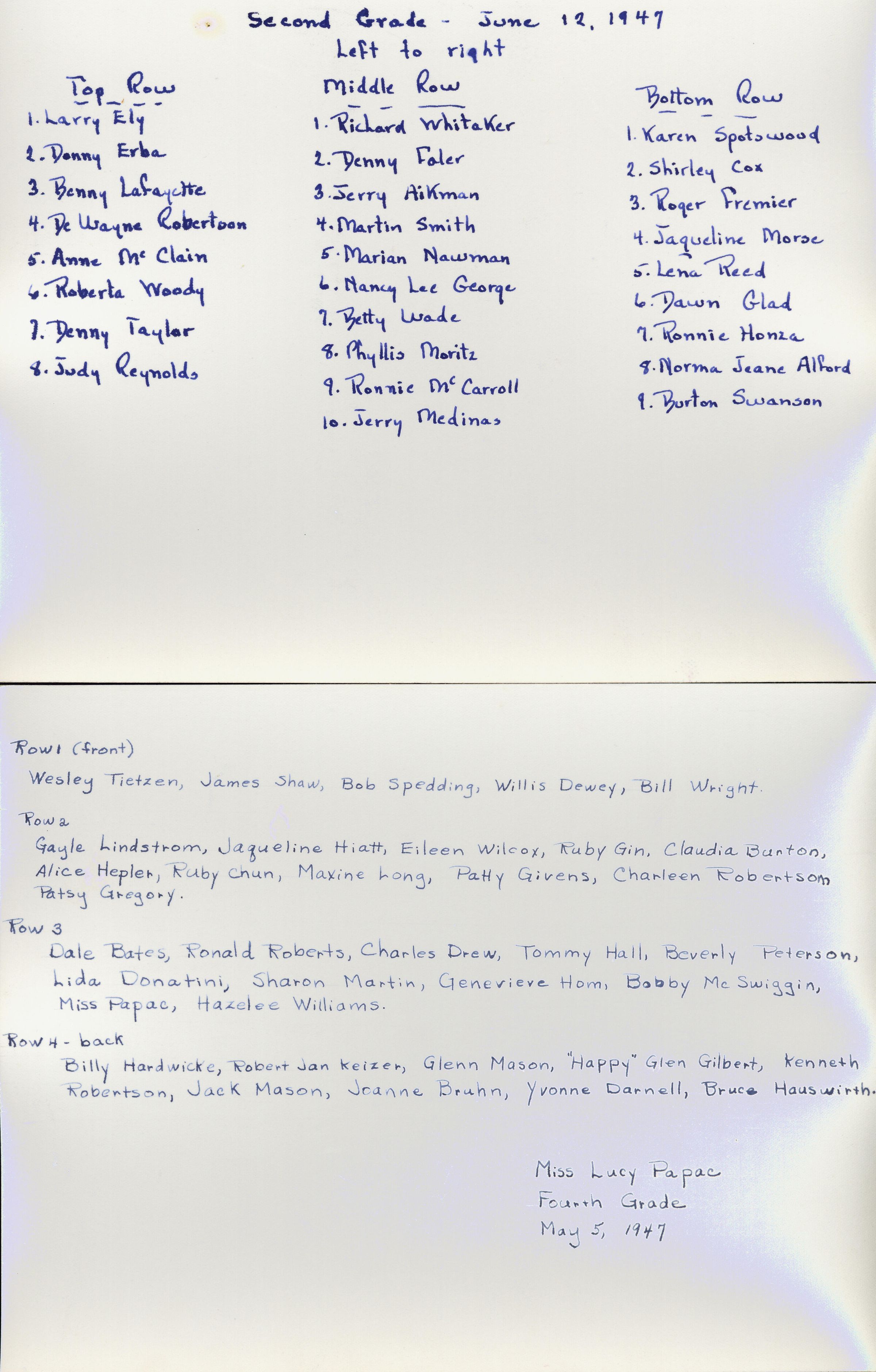 1947 Class 4 - Miss Lucy Papac, teacher, verso, University Avenue SchoolEntry/Object ID