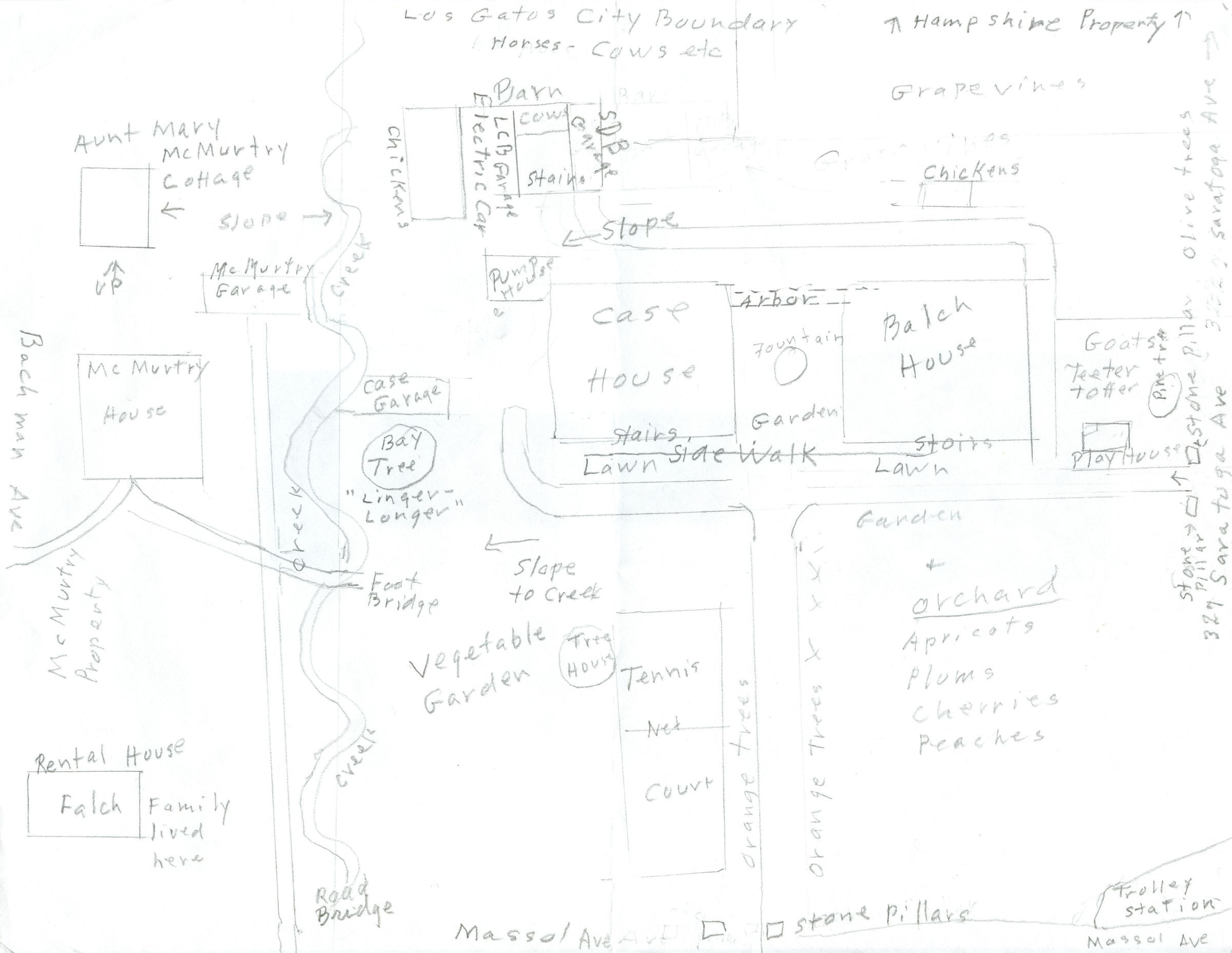 When she was in her 90s, Mary Balch Kennedy drew this map from memory of her childhood home. Note that the Case House is on the left and the Balch house is on the right, separated by a garden area with a fountain and arbor. Massol Avenue is at the bottom of the drawing; Saratoga Avenue to the right. BAL006Collection