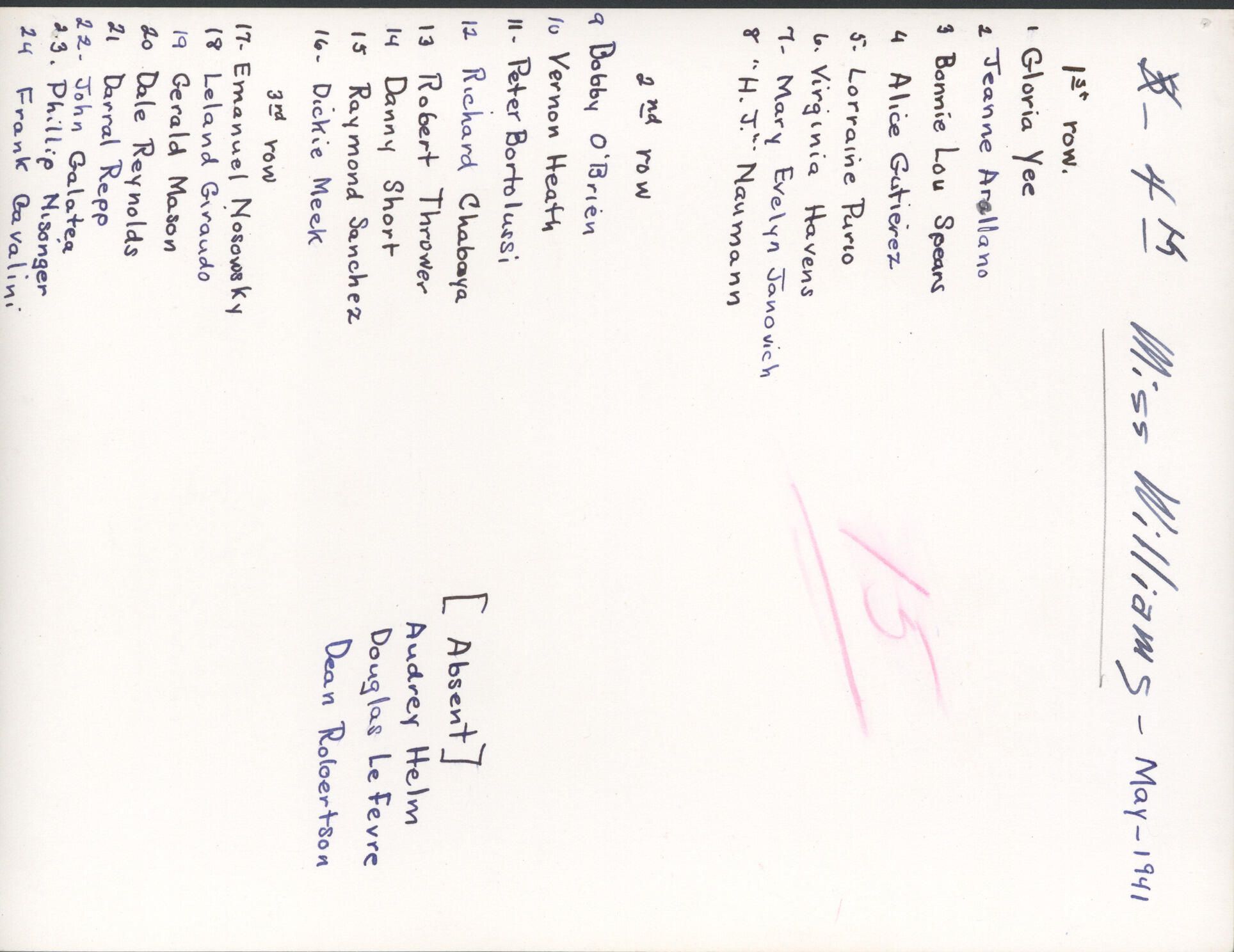 1941 Class 4 - Miss Macy Williams, teacher, verso, University Avenue SchoolEntry/Object ID
