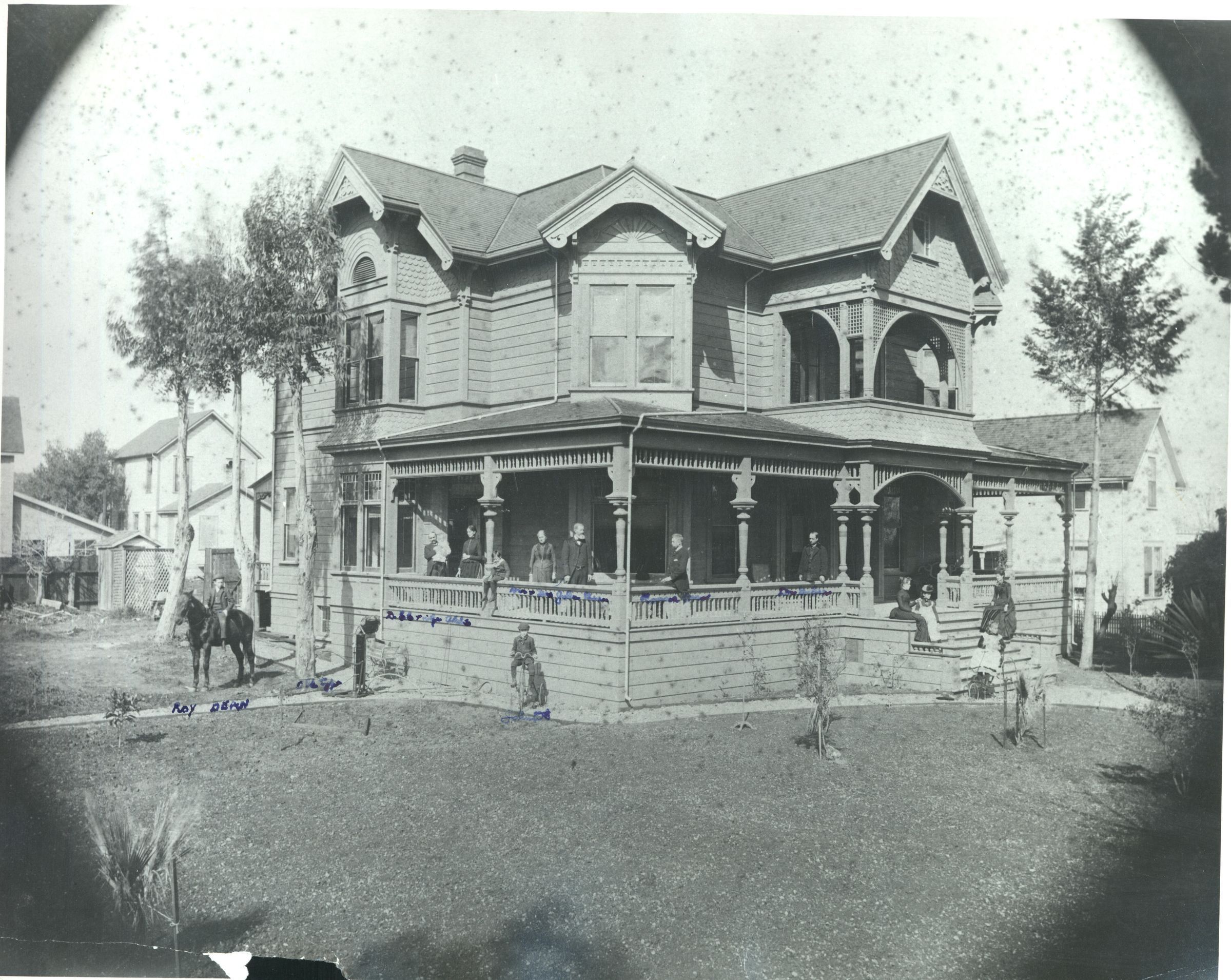 John Bean and Dr. Robert Gober house on North Santa Cruz Ave. The Bean and Crummey families are shown here on the porch and in the yard. The house was built in 1889 and demolished in 1938 to make way for the expanding business district. RES092Collection