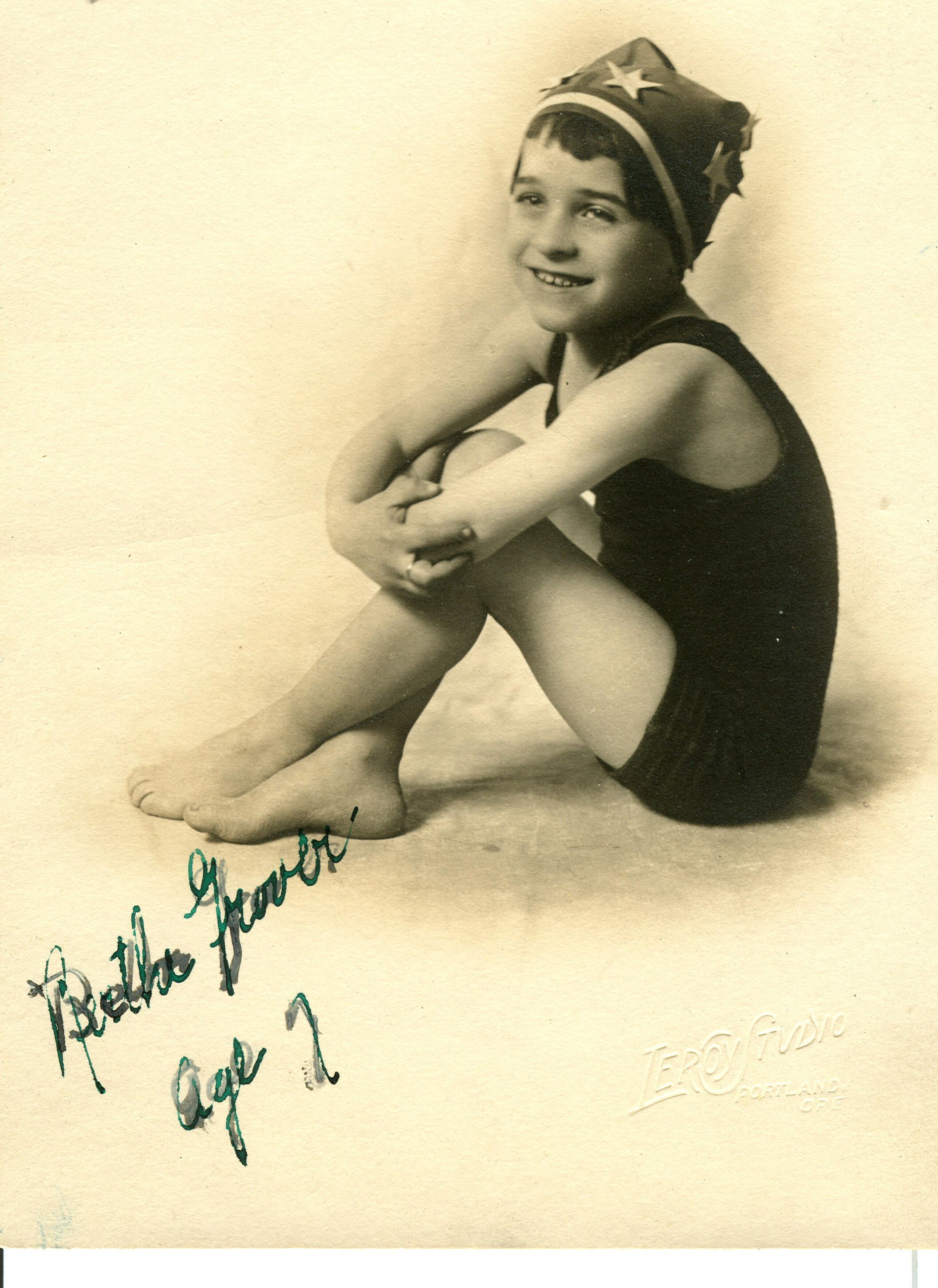 In 1929, Beth Grover, age 19, arrived at "The Cats" estate of C.E.S. Wood and Sara Bard Field. She was riding in Sissy Seaman's roadster with pigskin seats. Born to a Russian refugee family, Beth became a swimming star as a child in Portland, Oregon, performing with seals at the Pantages Vaudeville Theater and demonstrating water stunts for the newsreels. She met divorcee Kitty Seaman Beck at a swimming pool in 1917 and was subsequently "adopted" by Kitty and her sister Emily G. Seaman, known as "Sissy." When C.E.S. Wood engaged Sissy to assist in writing the biography of his father, the first surgeon general of the U.S. Navy, Beth Grover came along to Los Gatos, where she soon became a reporter for the Mail-News. This photograph of Beth Grover was taken when she was seven years old, in 1917. RON011Collection