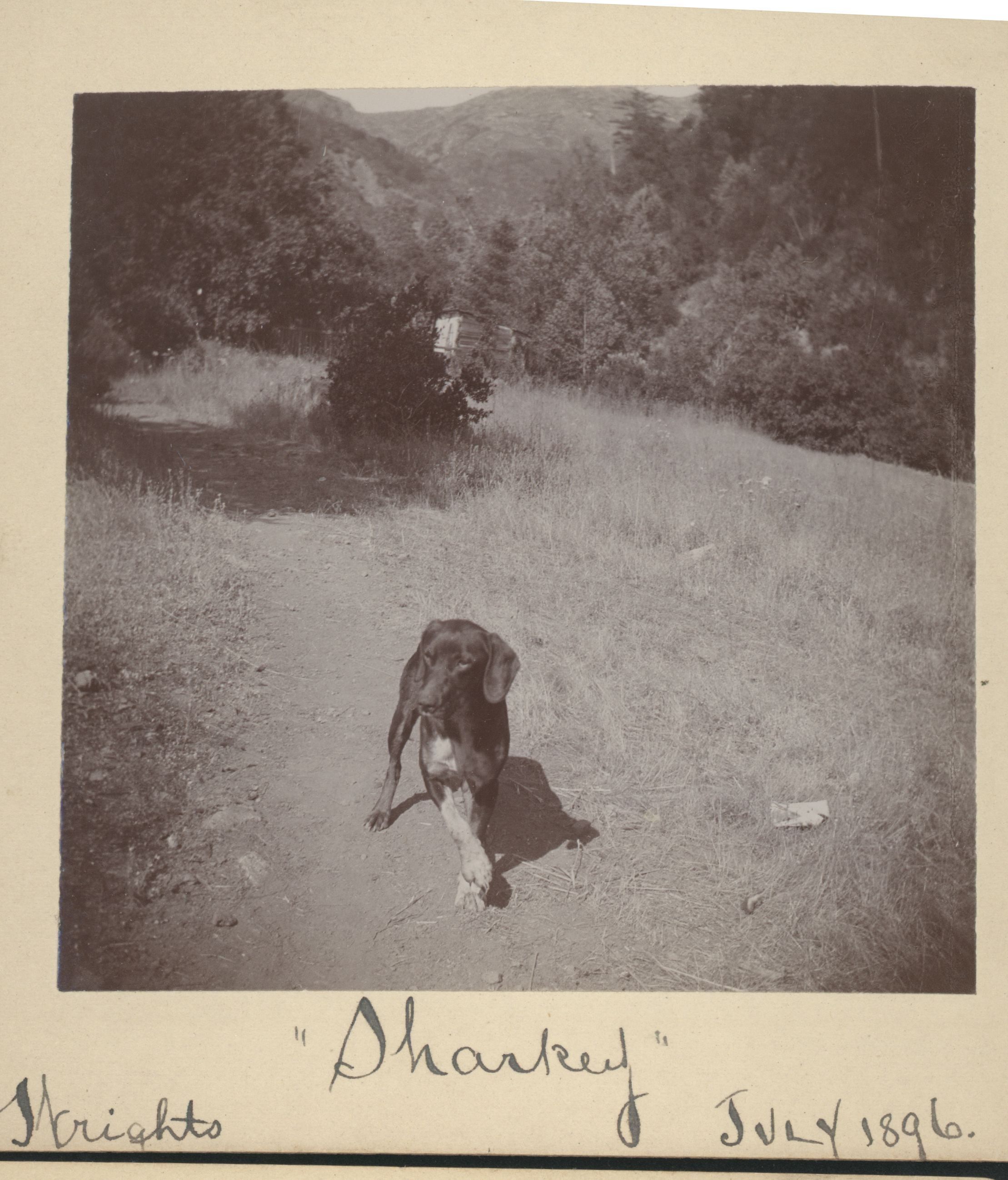 The dog, Sharkey, in the German colony at Wrights Station. Along the South Coast Pacific Railroad that travels through the Santa Cruz Mountains and stops just near the summit, is the area known as Wright's Station or Wrights. Area is named after James Richards Wright, who owned a residence/hotel in the area. Wrights became a welcoming community with a depot, store, post office and blacksmith shop. Wrights Station also became an important fruit growing and shipping point area for Los Gatos and Santa Cruz Mountains. MTN010Collection
