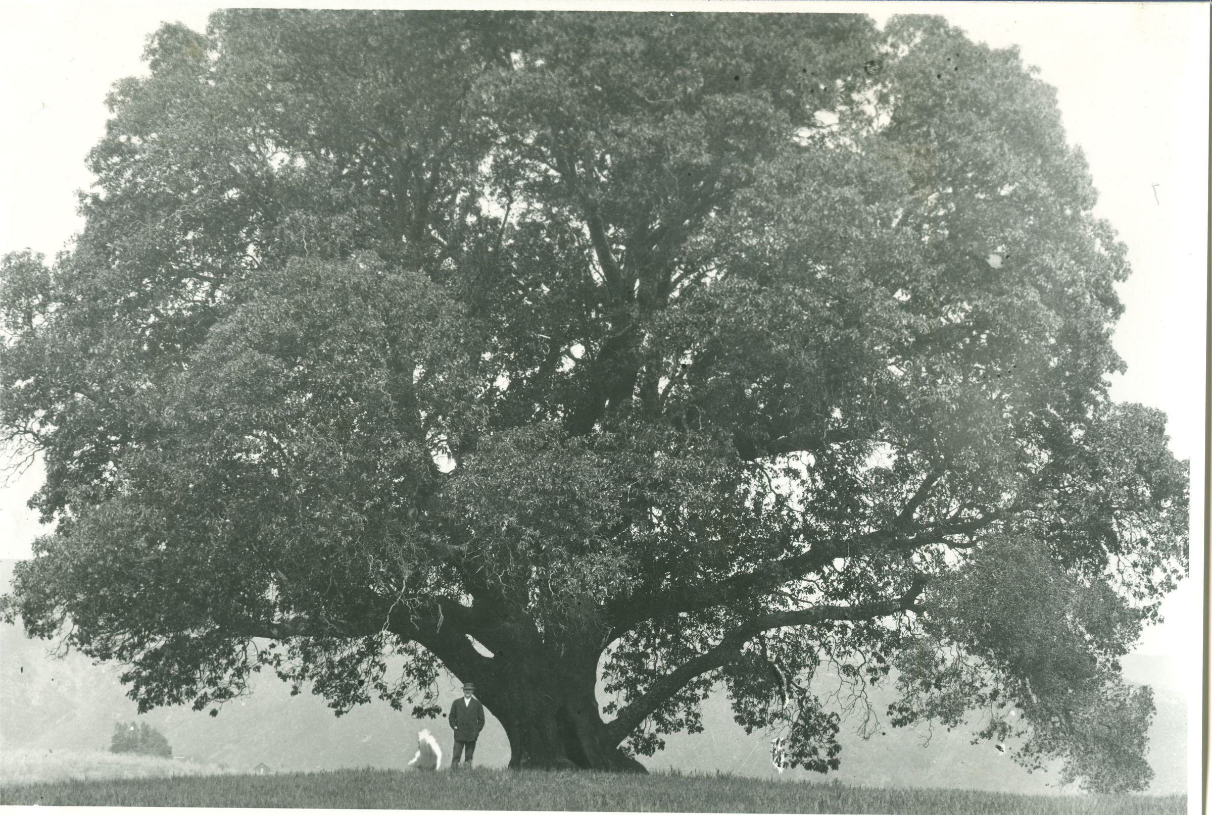 The biggest Madrone with Dr. Harry Tevis standing underneath on November 16, 1912. The tree blew down in the 1930s. The biggest Madrone with Dr. Harry Tevis standing underneath on November 16, 1912. The tree blew down in the 1930s. NVC038Collection