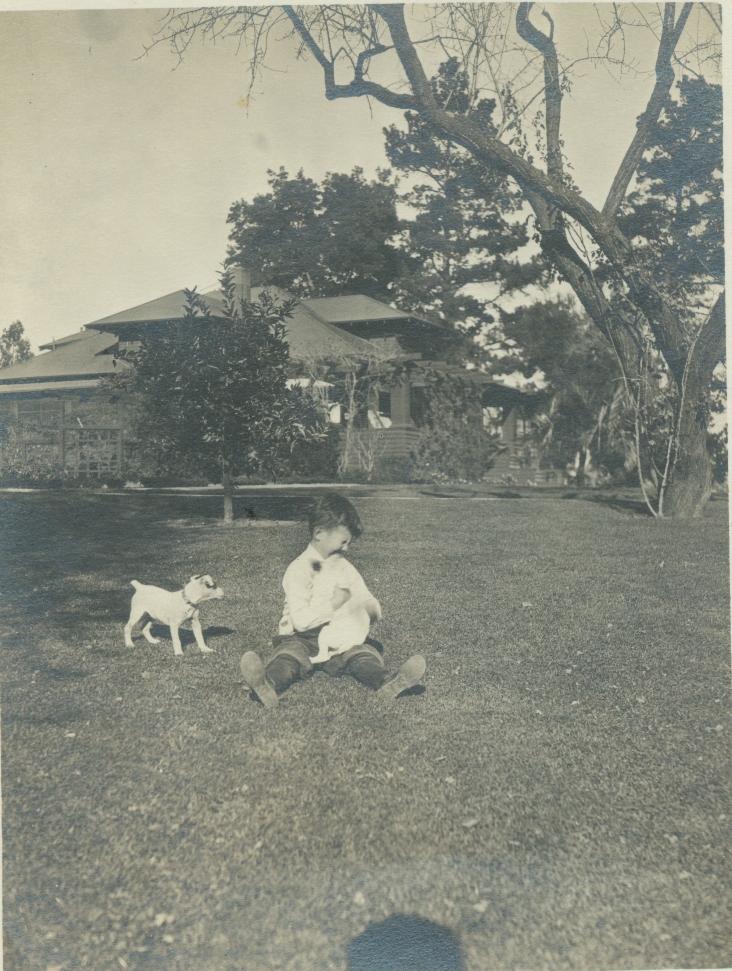 Bill Balch on the lawn with the house he was born in in the background. He is sitting in front of the Case home (not shown) which was on the same property on Massol Ave. The Bay Street apartments stand now at this location. BBC009Collection