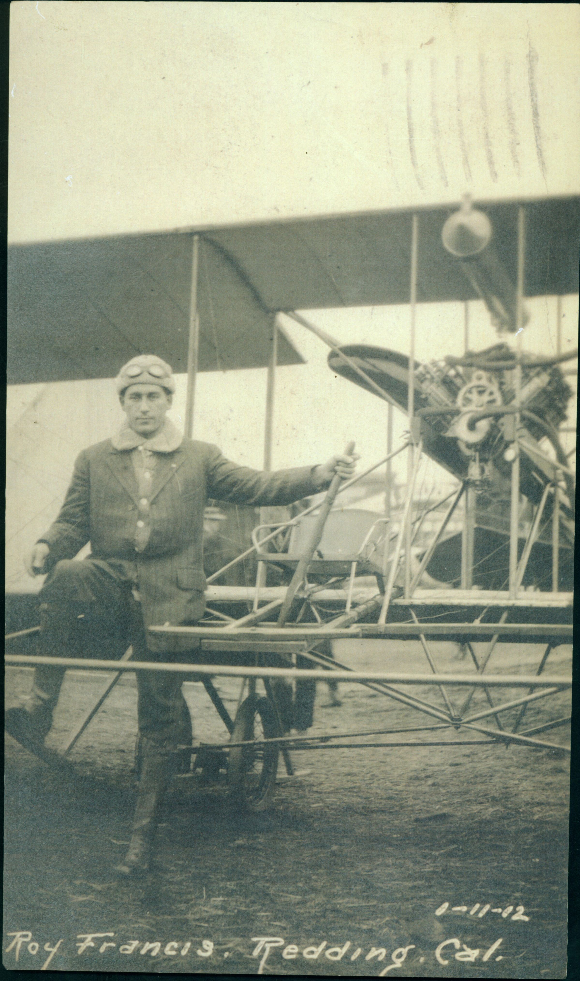 Roy Francis is pictured here in Redding, California in 1912. An article in the September 9, 1912 San Jose Mercury newspaper noted that "Roy Francis has left the farm once more. After a period of about two weeks, passed in milking cows, feeding chickens, horses, pigs and the other animals of the farm, he heard the call of the biplane and responded. Yesterday morning at 9:20 o'clock, he rose over the treetops of Los Gatos and in exactly ten minutes he was on the ground in a field just south of town on the Monterey Road." He often gave exhibitions of flying. FIN061Collection