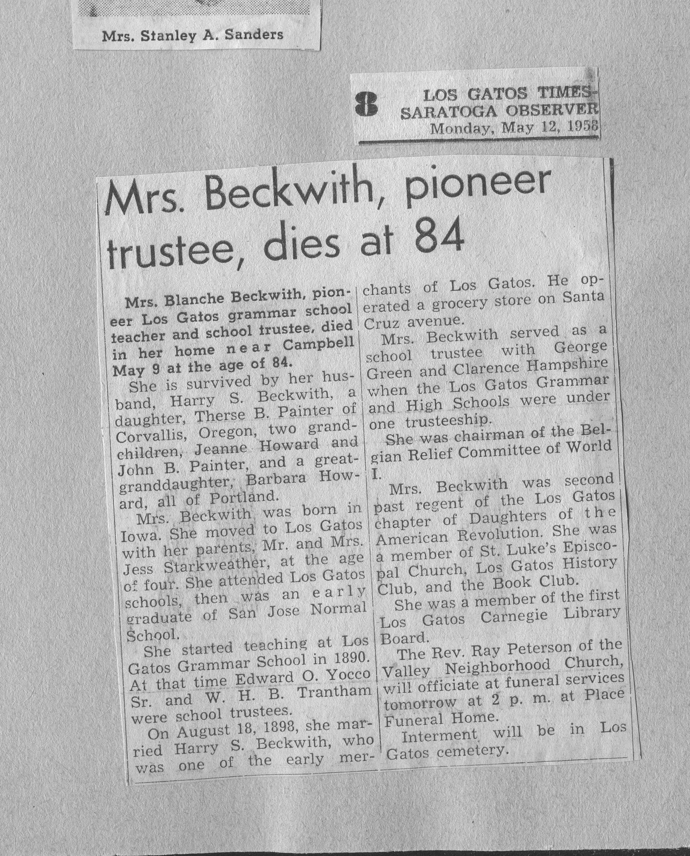 Obituary of Blanche Beckwith, pioneer Los Gatos grammar school teacher and school trustee. She was a member of the Los Gatos Chapter of the D.A.R. and a member of the first Los Gatos Carnegie Library Board. DAR033Collection