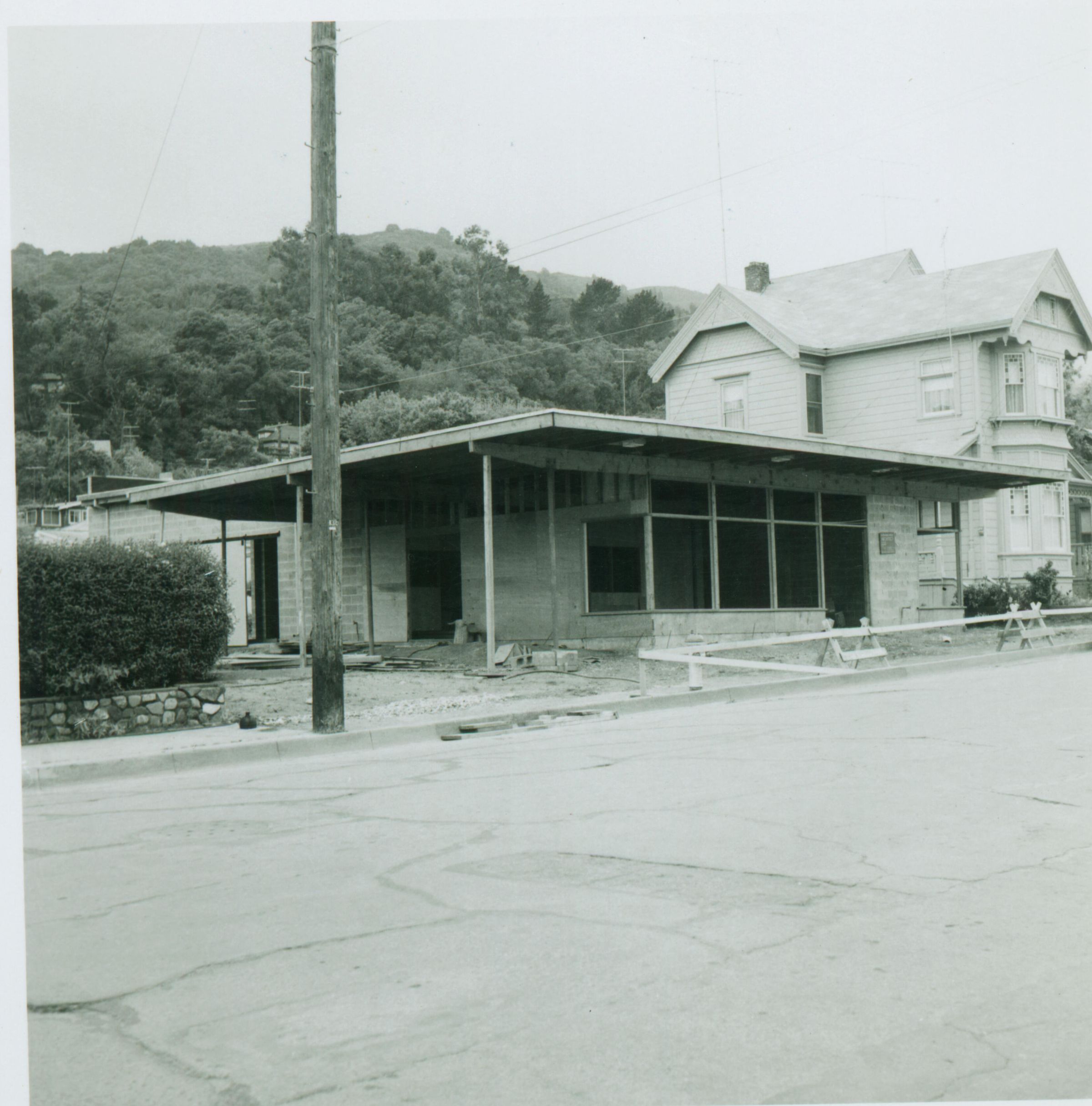 Showing the construction of the cinderblock building at 245 W. Main St., 1956-57, that was occupied by McAbee's Building & Fuel in 1958-62. In 1963-64, the Happy Dragon Thrift Shop moved into the building, where it remains to this day. The women of the Happy Dragon came up with $7,000 for a down payment by sending letters to Presbyterian churches around the country, asking for retail stamps - Green Stamps, Blue Chip Stamps, and others that could be redeemed for cash. The proceeds from the Happy Dragon support Ming Quong. FAR050Collection