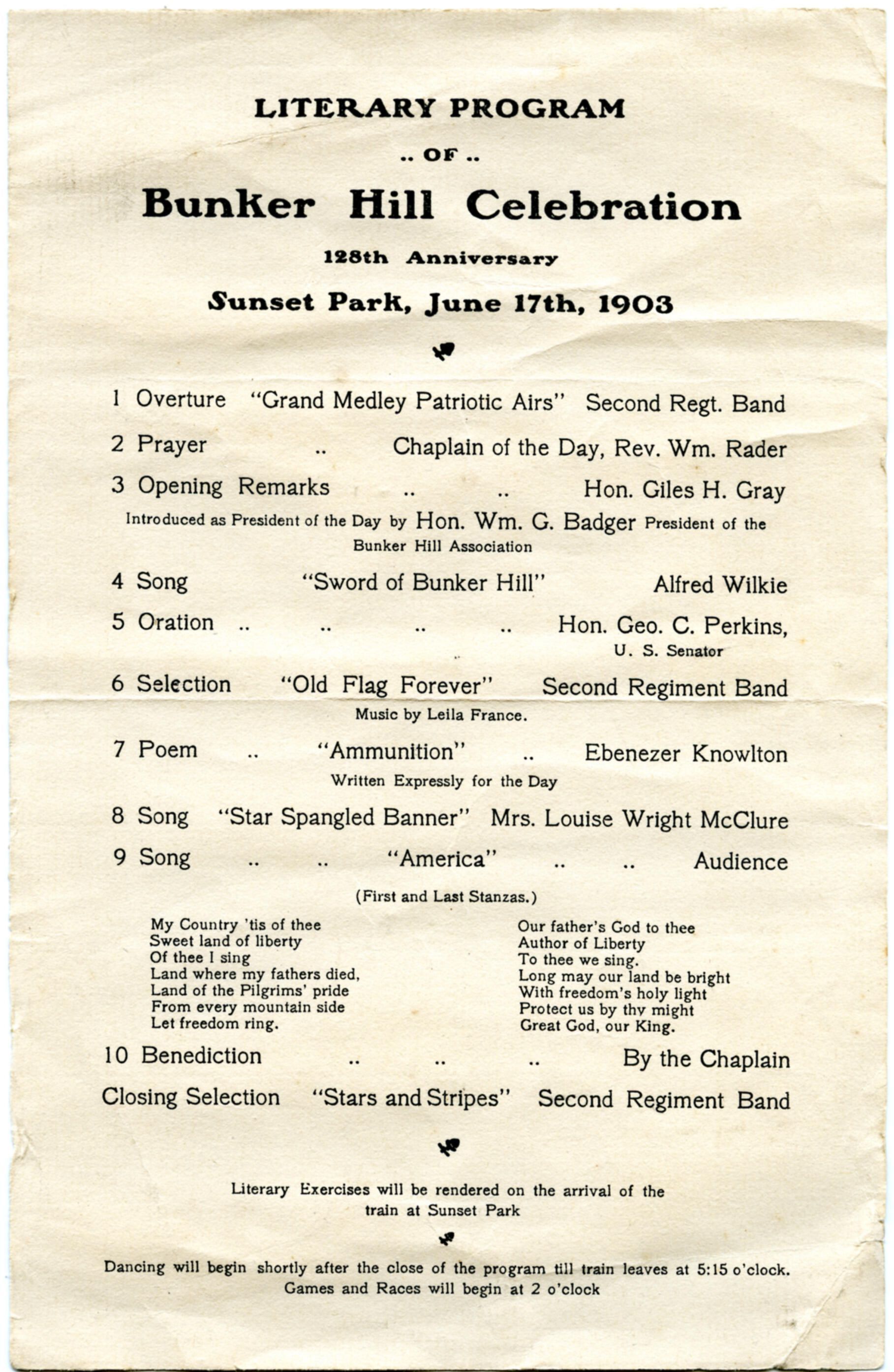 Literary Program of the Bunker Hill Celebration. Noted attendee: George C. Perkins, U.S. Senator. BH013Collection