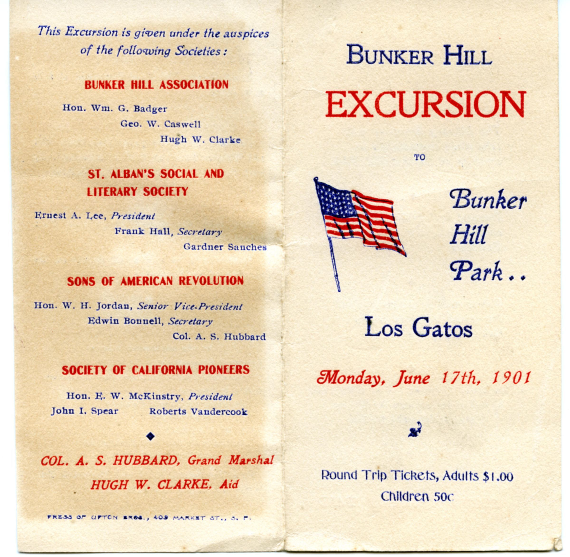 Bunker Hill Park Excursion Program Flyer; Bunker Hill Association; St. Alban's Social and Literary Society; Sons of American Revolution; Society of California Pioneers;Collection