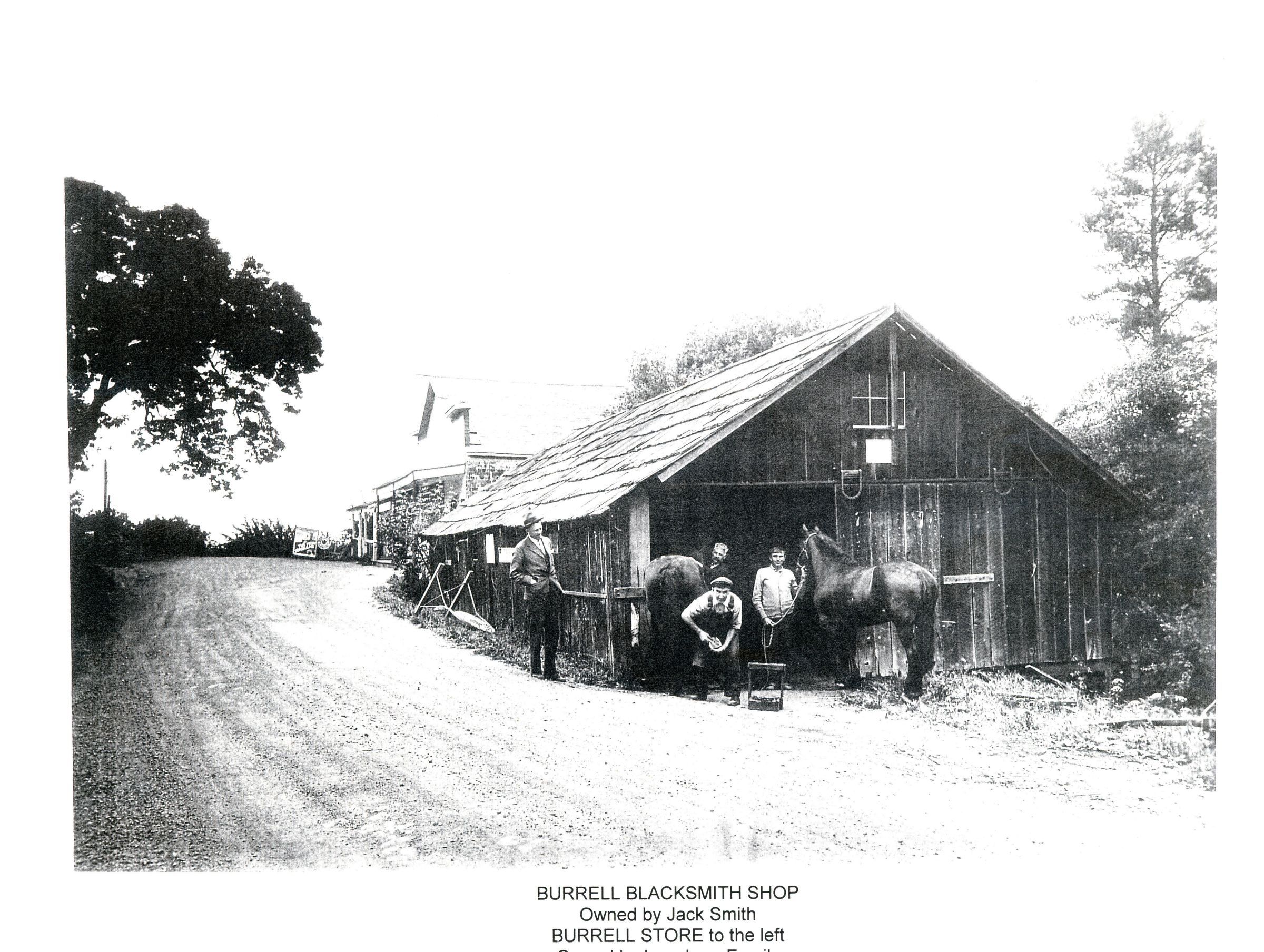 The Burrell Blacksmith Shop was owned by Jack Smith. The Burrell Store is to the left. WIL001Collection