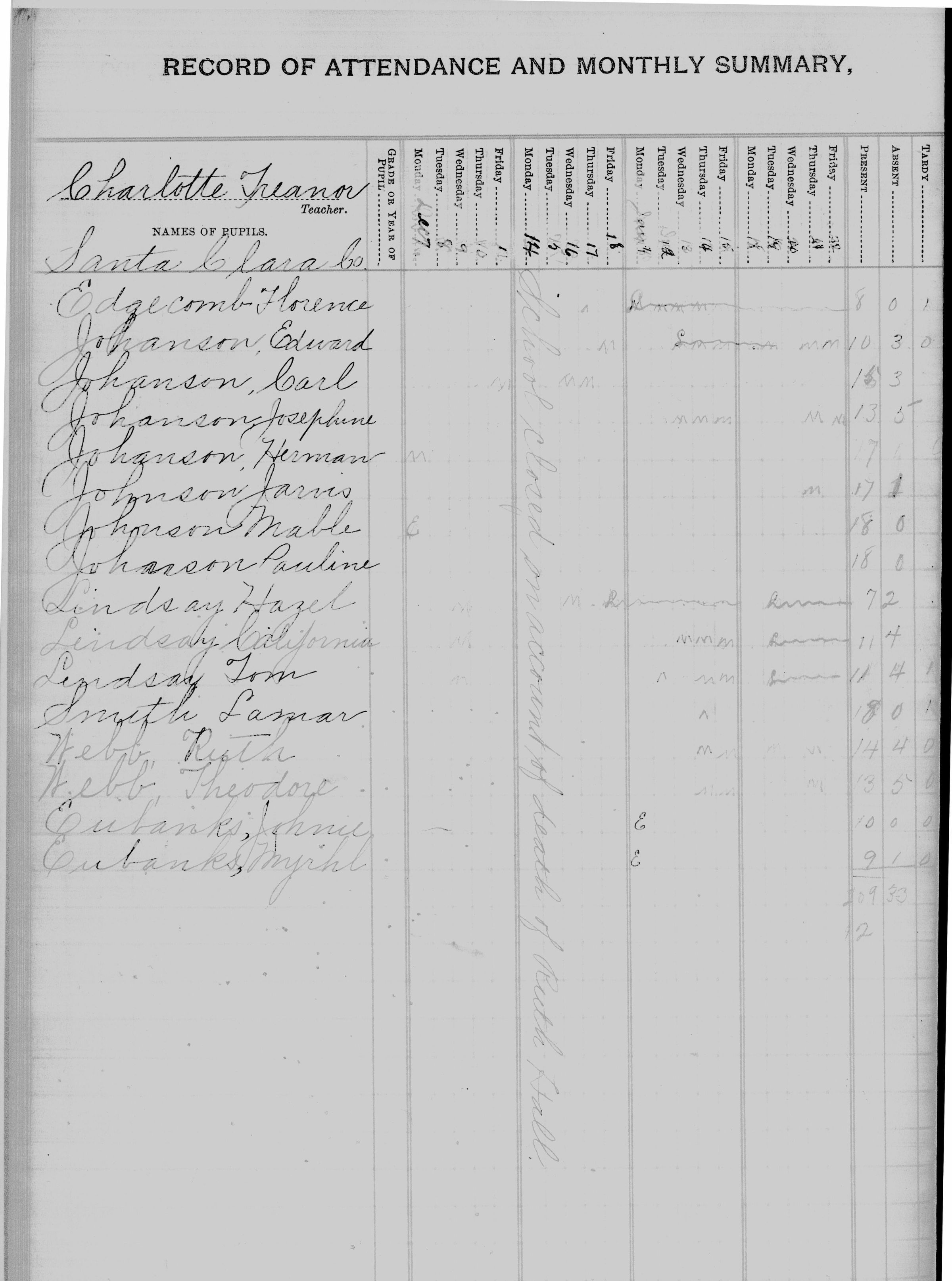 Record of attendance for the students of Charlotte Treanor. Note that school was closed on December 14, 1908, because of the death of Ruth Hall. WIL023aCollection