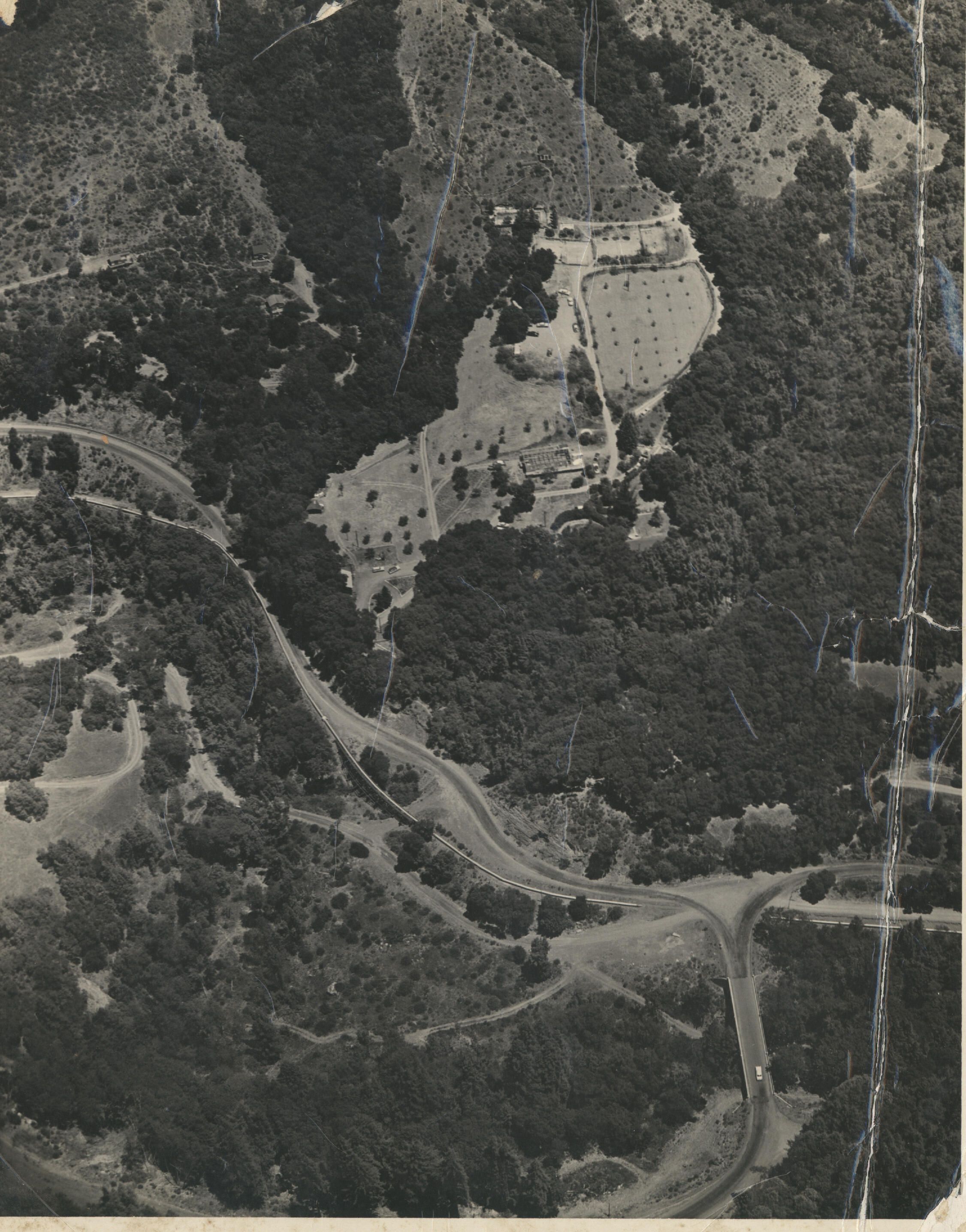 Lupin Lodge nudist colony from the air. Alma bridge is on the right. Photograph was taken shortly after the dam was built. FRA016Collection