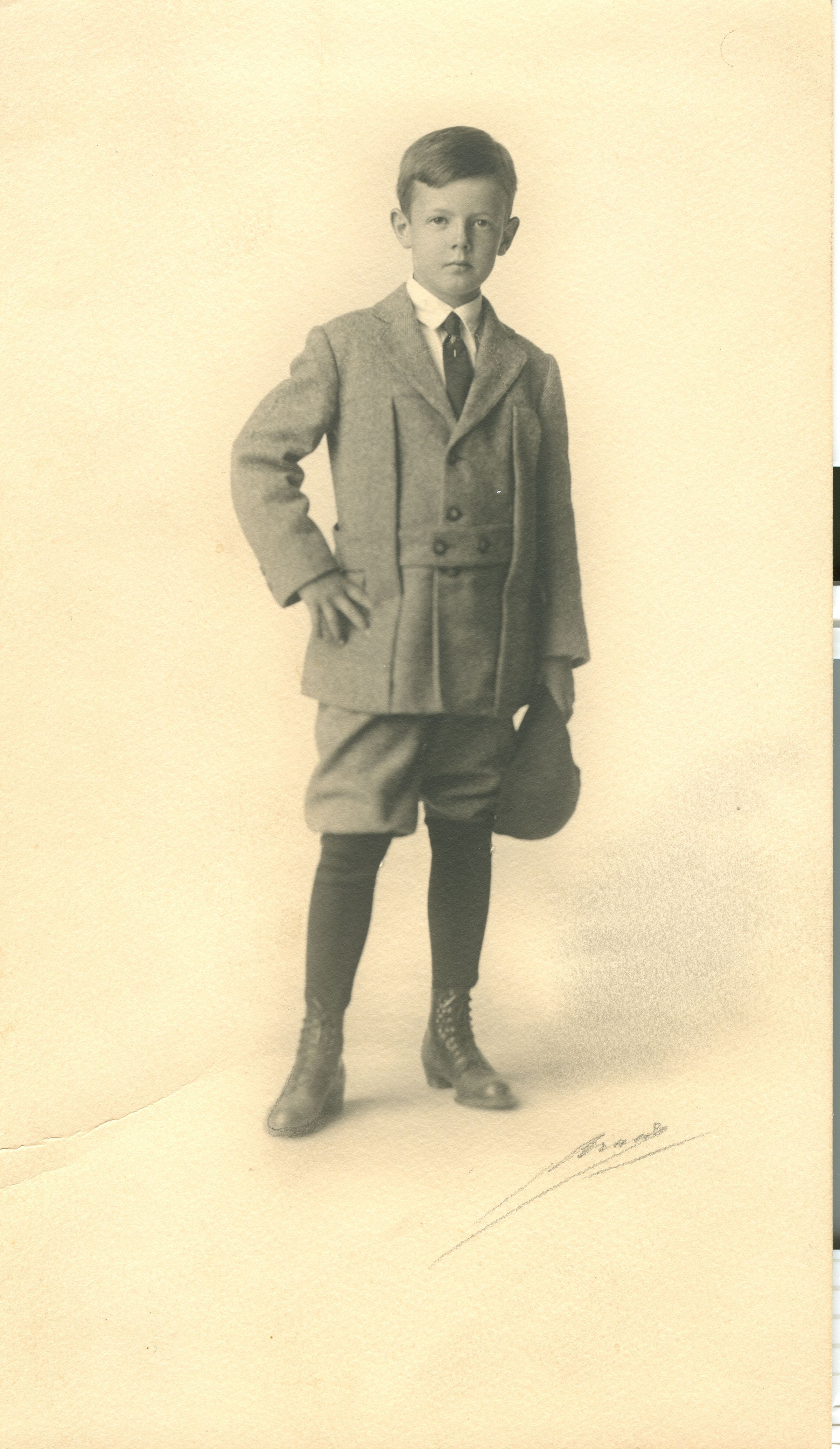 Studio portrait of Carl Balch (1903-1998). In an April, 2006 interview, Mary Balch Kennedy recalled that the children at the Balch/Case compound would sometimes soap the tracks of the Interurban electric railway which ran past their home. The result was that the cars could not make it up the hill past the Hamsher residence. The kids would then climb up into the trees to "watch the show." A worker would have to get out of the car, carrying a bucket of sand, to sand the tracks and make them usable again. BAL025Collection