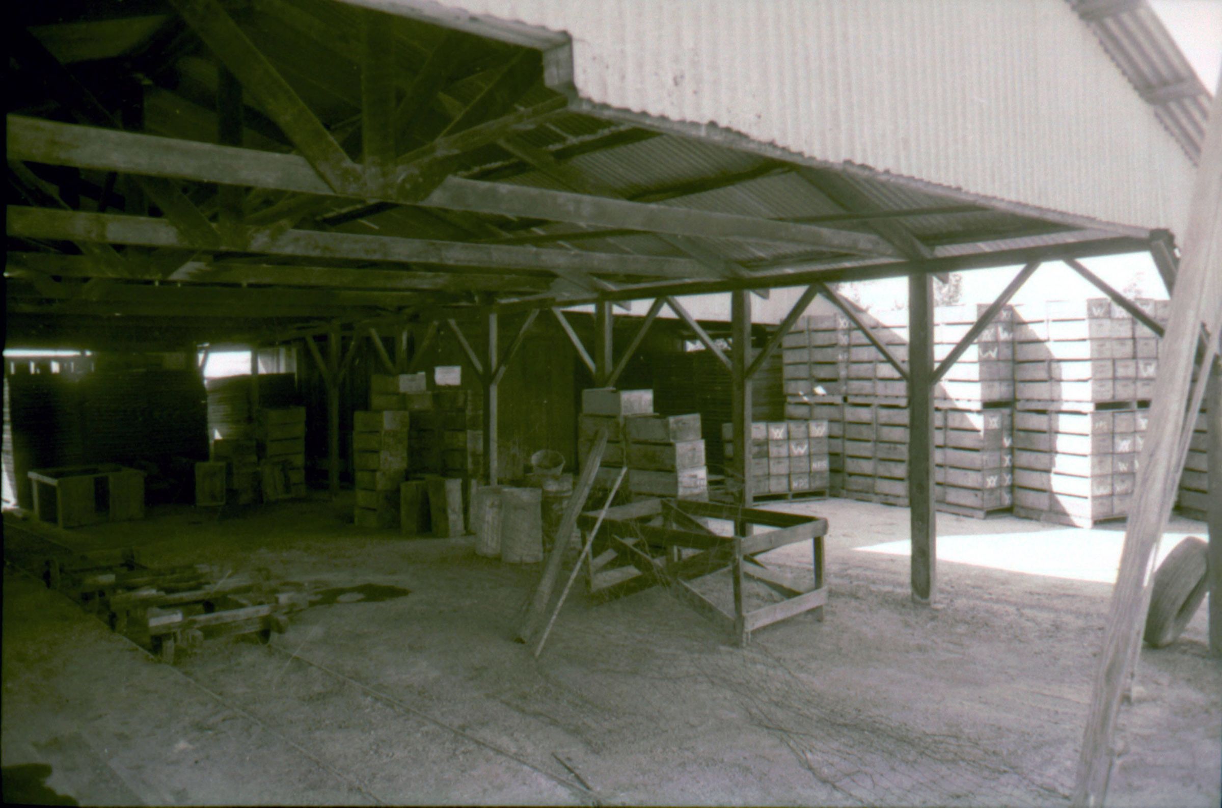 To the left center of this picture are shown carts on rails. The table to the right was for the tray until it was filled with cut fruit, then it was loaded on to the cart to go by rail to the sulfur sheds. AG102Collection