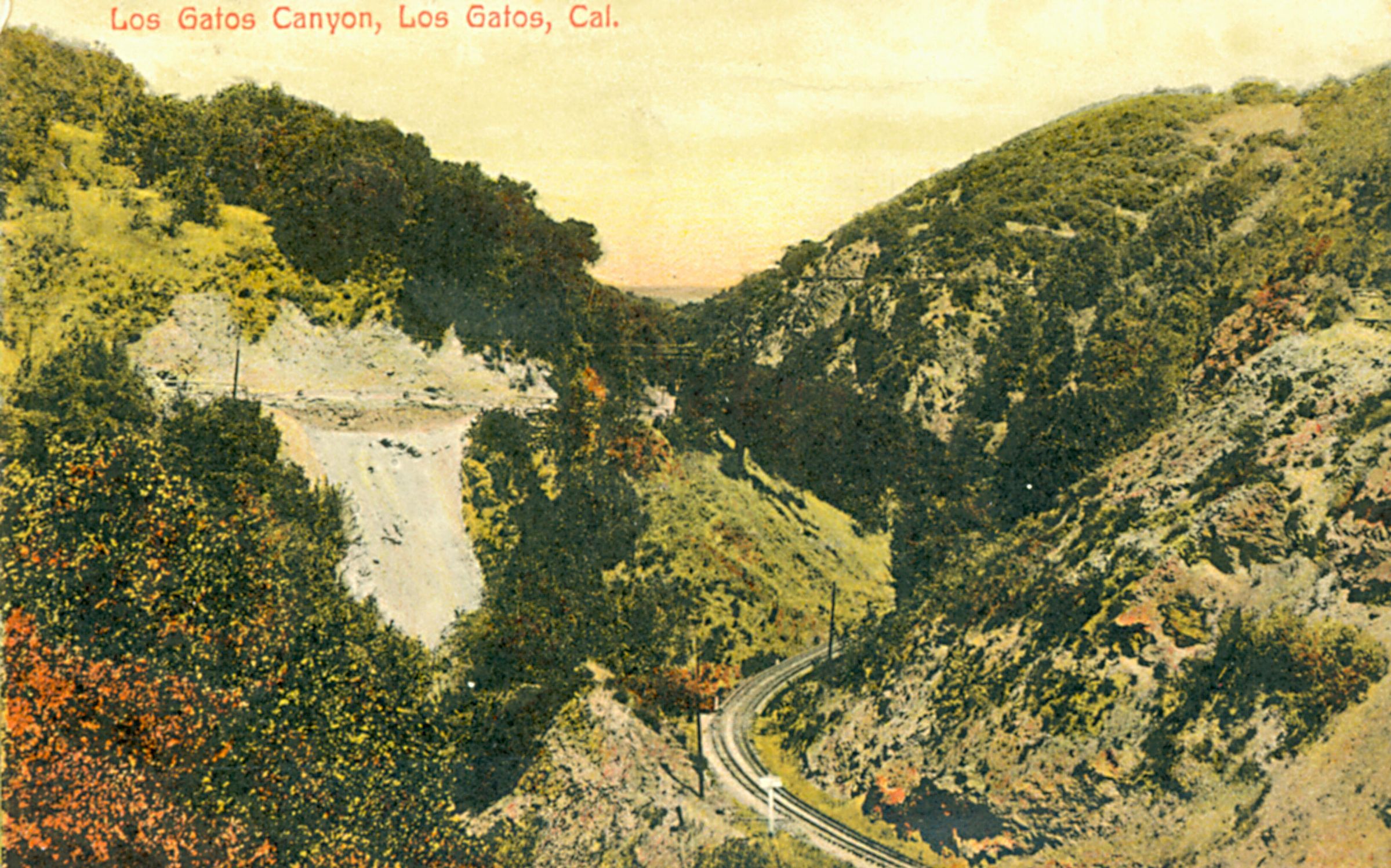 A vintage view of the canyon just south of the Los Gatos town limits. The railroad ran below, the automobiles above. BER004Subject