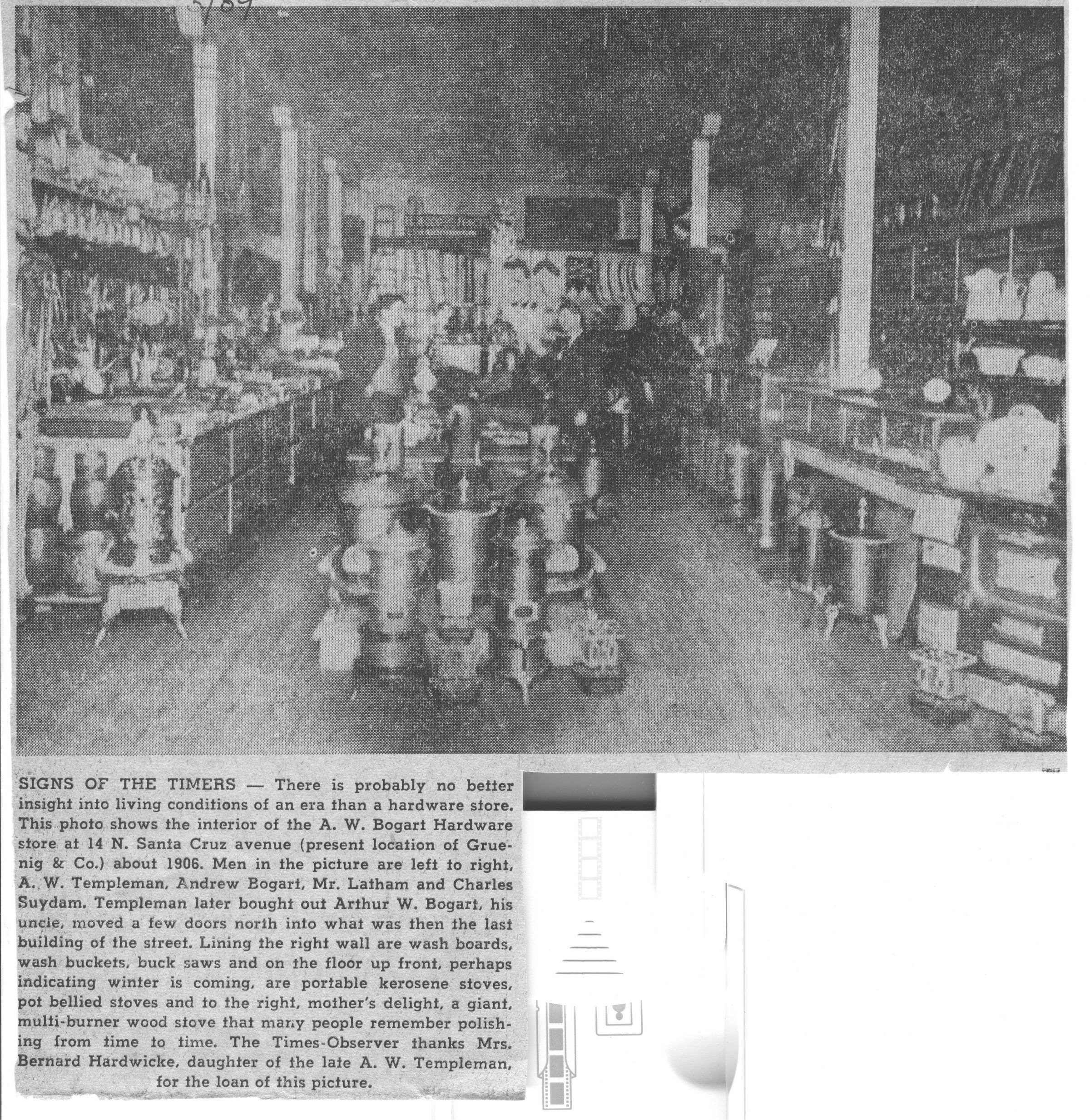 Bogart's Hardware Store was located at 14 N. Santa Cruz Avenue, and is pictured here before 1916 when it was purchased by A. W. Templeman and moved, in 1926, to 24 N. Santa Cruz. The three-story building at 24 N. Santa Cruz still stands, and it had the first freight elevator in town. Pictured, left to right, are A.W. Templeman, Andrew Bogart (son of owner A. W. Bogart), Mr. Latham, and Charles Suydam. Mima remembers that Mr. Latham liked to play practical jokes. One day he set all the alarm clocks to go off. A "very particular lady" was embarrassed when she purchased one and it sounded on the way home. She couldn't get it to stop. TEM005aCollection