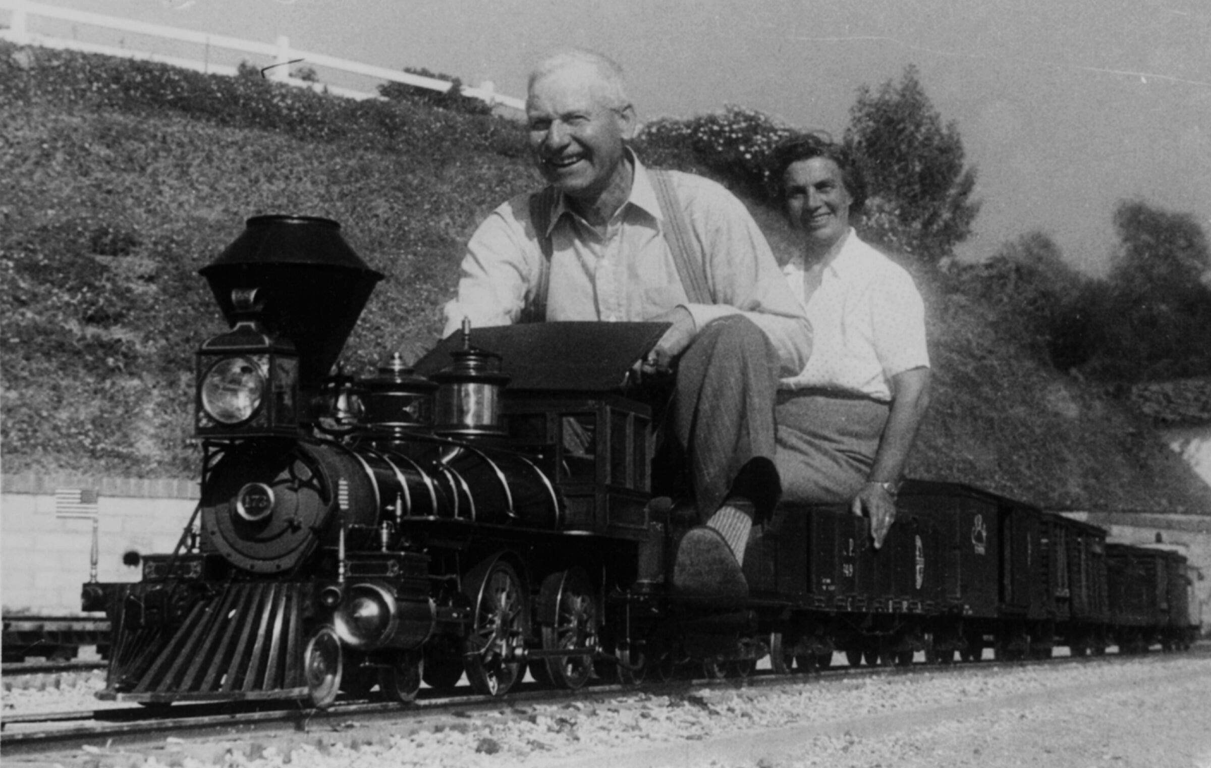 In 1949, Walt Disney bought his own 1 1/2-inch scale, 7 1/4-inch gauge live-steam locomotive, the Lilly Belle. Upon completion of his backyard Carolwood Pacific Railroad, Disney invited Billy and Geraldine Jones to visit his Holmby Hills estate. Reminiscent of the ornate locomotives on which he first began his career, Jones displays a wide grin as he takes the little teakettle for a run. JON036Collection