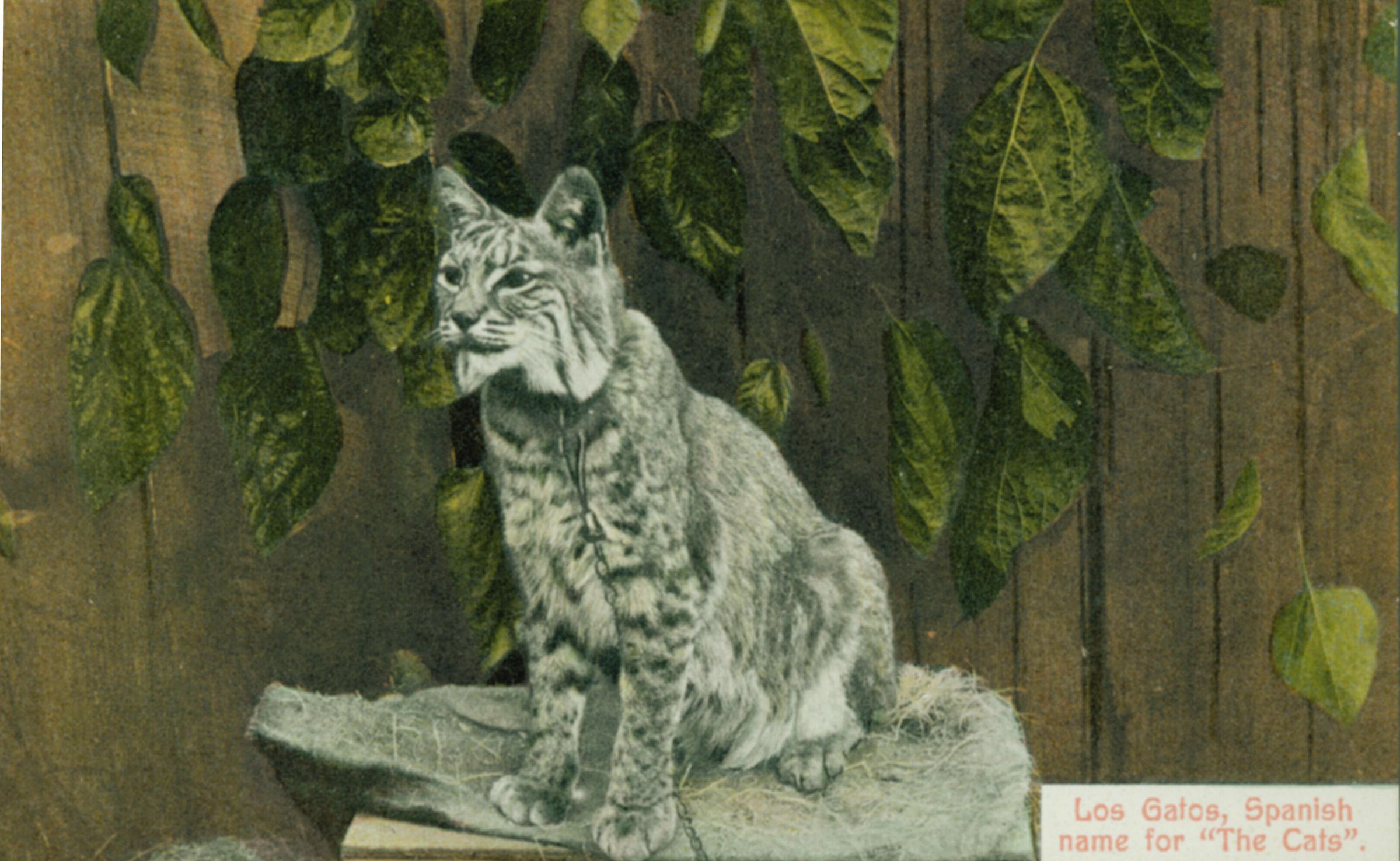 Los Gatos - Spanish Name for "The Cats." Chained bobcat sitting. It was not unusual to see bobcats in the hills south of Los Gatos. Sometimes they were captured, sometimes killed. A hunter might decide to drive into town with the cat strapped to the hood of his car, so that everyone could see the animal. Poems appearing in the 1913 Wildcat annual indicate that a living bobcat served as a mascot at sports events. "Bought by the boys for a five dollar bill," the cat died an untimely death just before a basketball game with Campbell. The cause of death may have been an improper diet or simply a lack of food. CTS016Subject