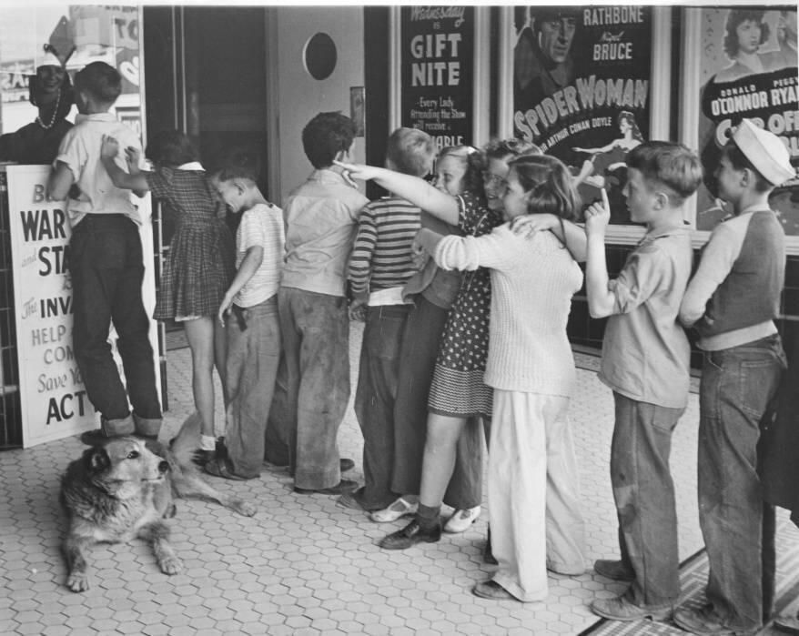 The Los Gatos movie theater, located at 41 North Santa Cruz Avenue since 1916, is pictured here in 1944, when it was called the Premier. Chief, the town dog, is keeping a watchful eye on the kids. CHFOO3Collection