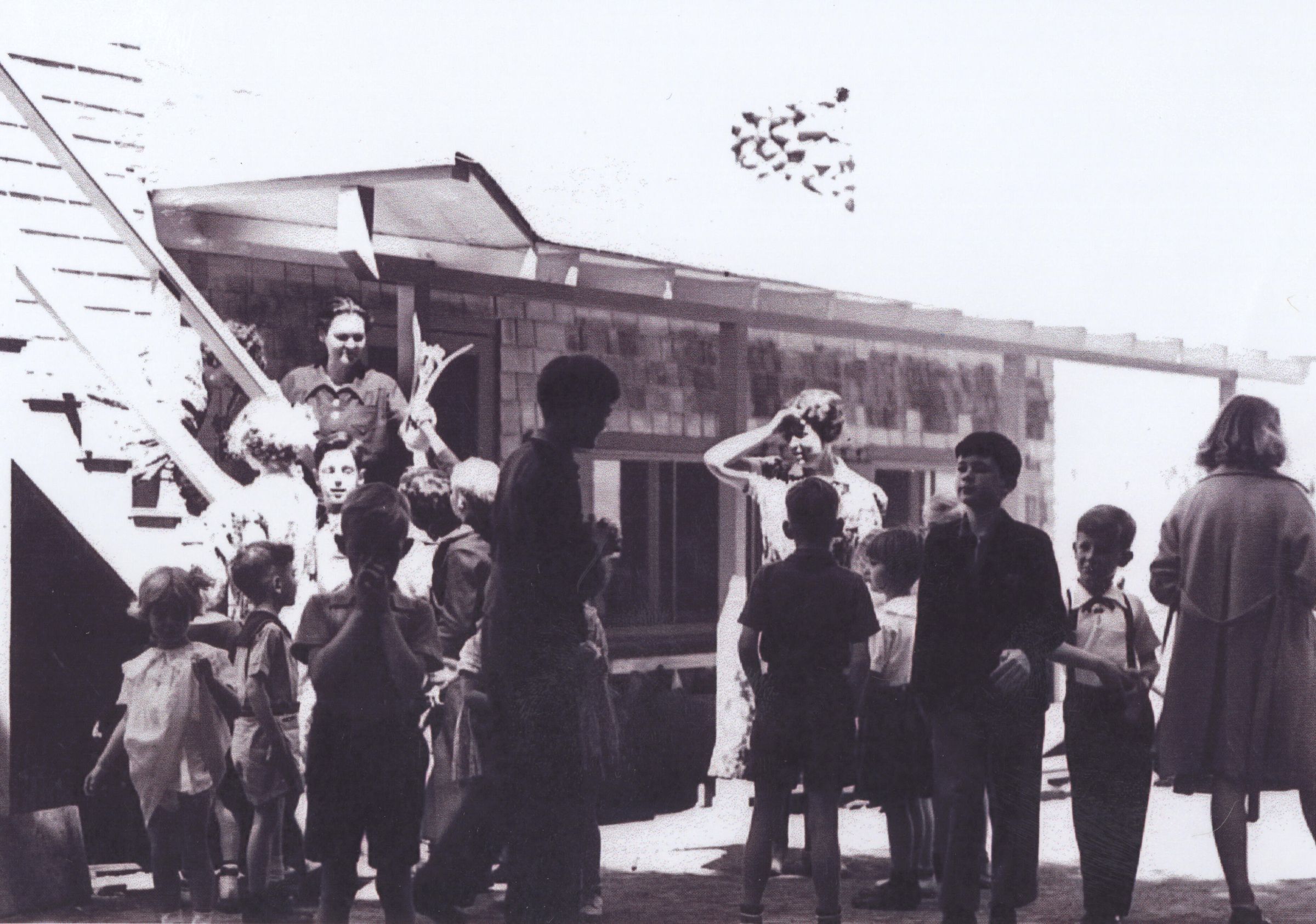 School children with several adults are pictured in the schoolyard. HIL005bCollection