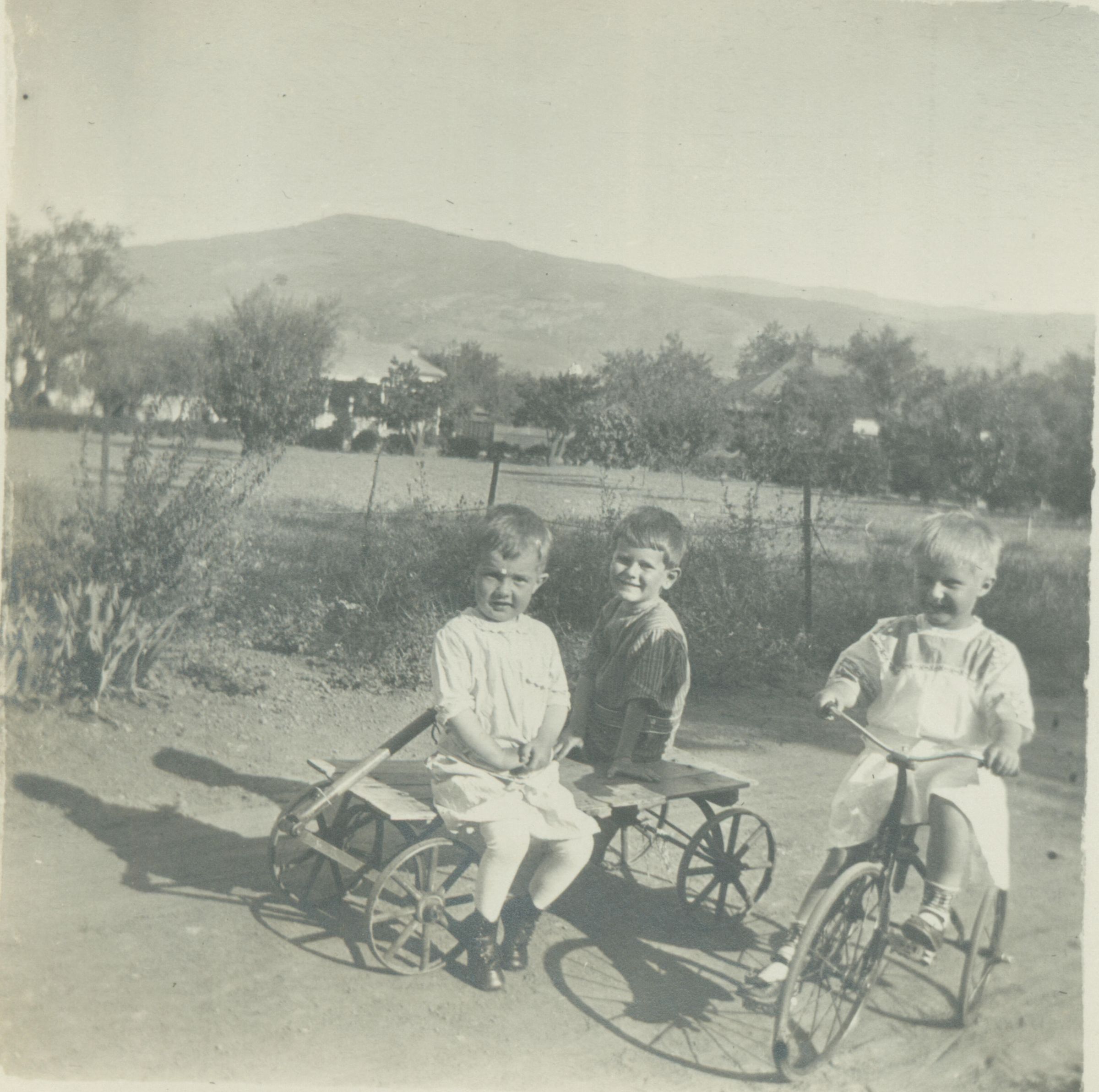 Bill Balch, Don Case, Mary Balch on their tricycles on the Massol property. Mt. El Sombroso is in the background. BBC039Collection