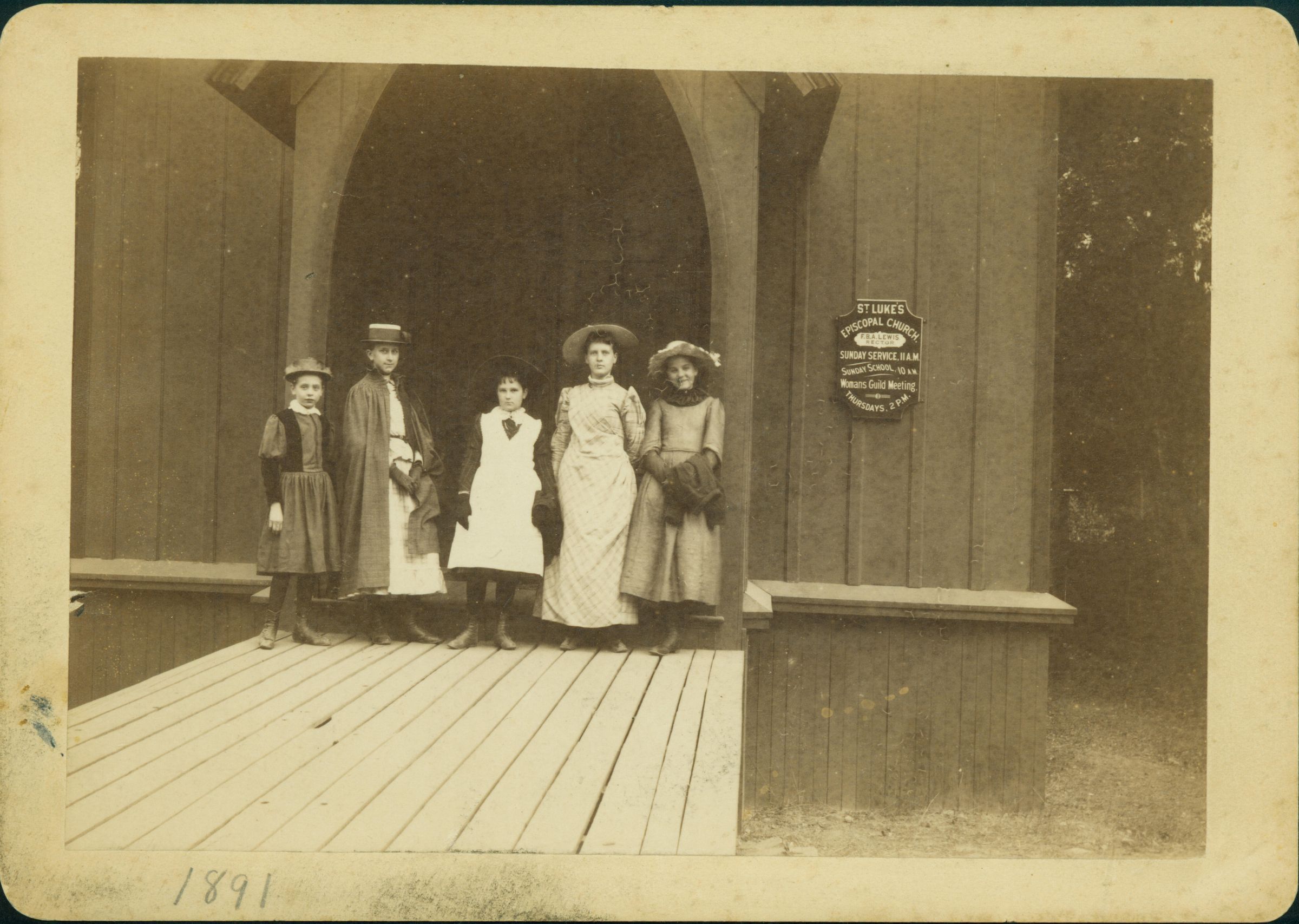This little wooden church was constructed in 1883 on land donated by Theresa Rector Lyndon, John Lyndon's first wife. The notice board indicates that F. B. A. Lewis is the rector. The church served until 1901, when it fell victim to fire. The probable identities of those pictured here in 1891 are, from left to right, Nina Robershotte, Edna Potter, Irma Lyndon, Clara Suydam and Alice DeLong. FAR006Collection