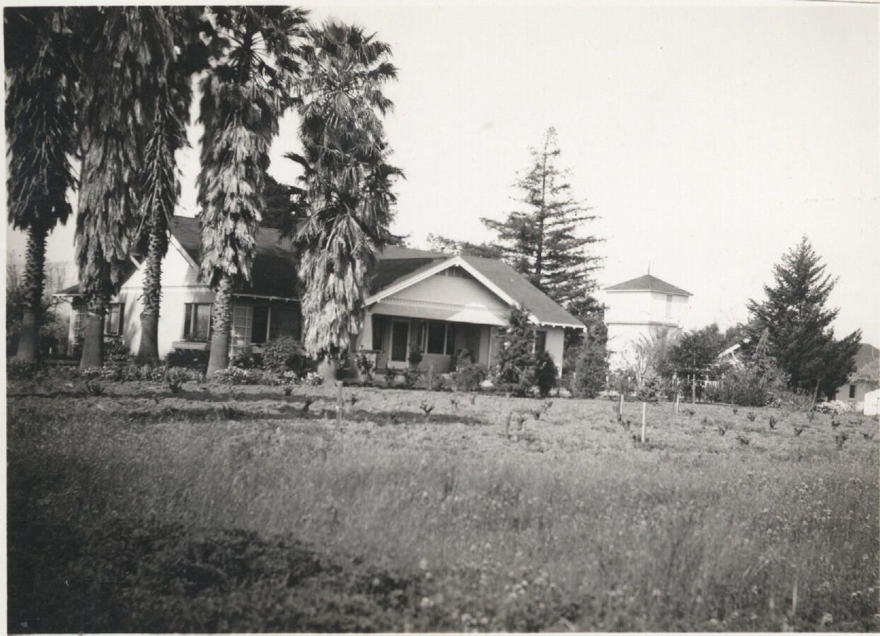 This snapshot shows the Cilker family ranch house in 1938, with grape vines planted in the front. The tank house is to the right. CLK043Collection