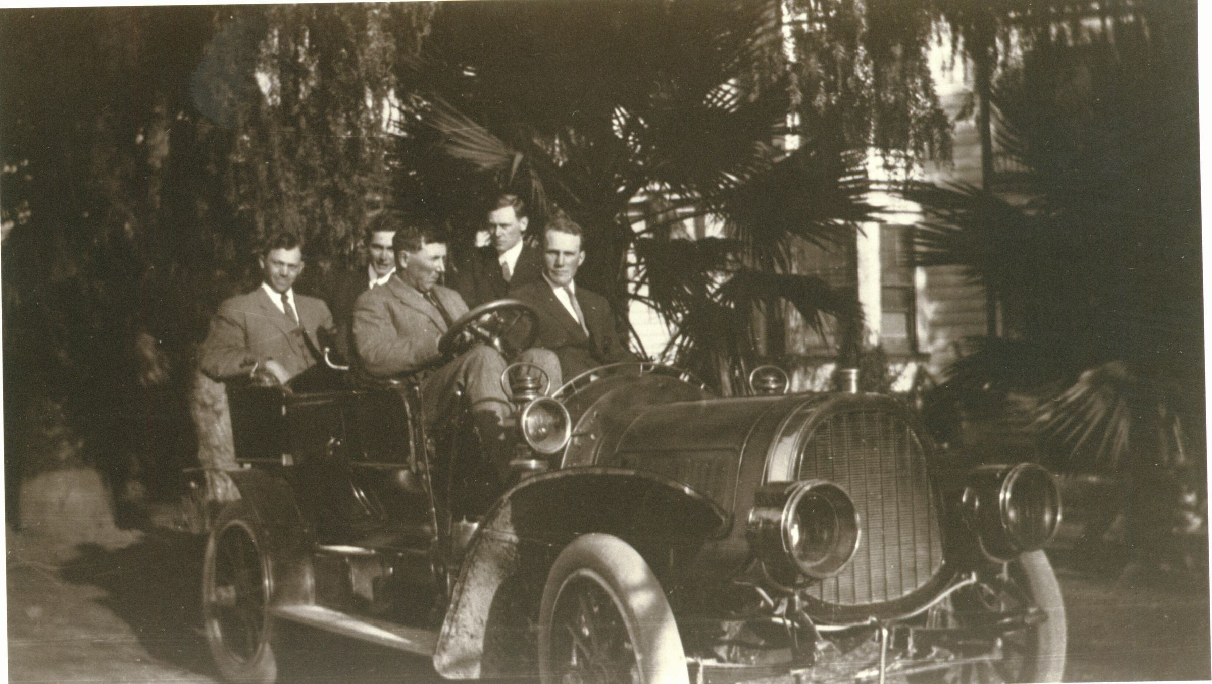 The five Cilker brothers, sons of pioneers John and Ann Jane Cilker, pose in their first automobile in front of the original ranch house. Arch is in the driver's seat. CLK039Collection