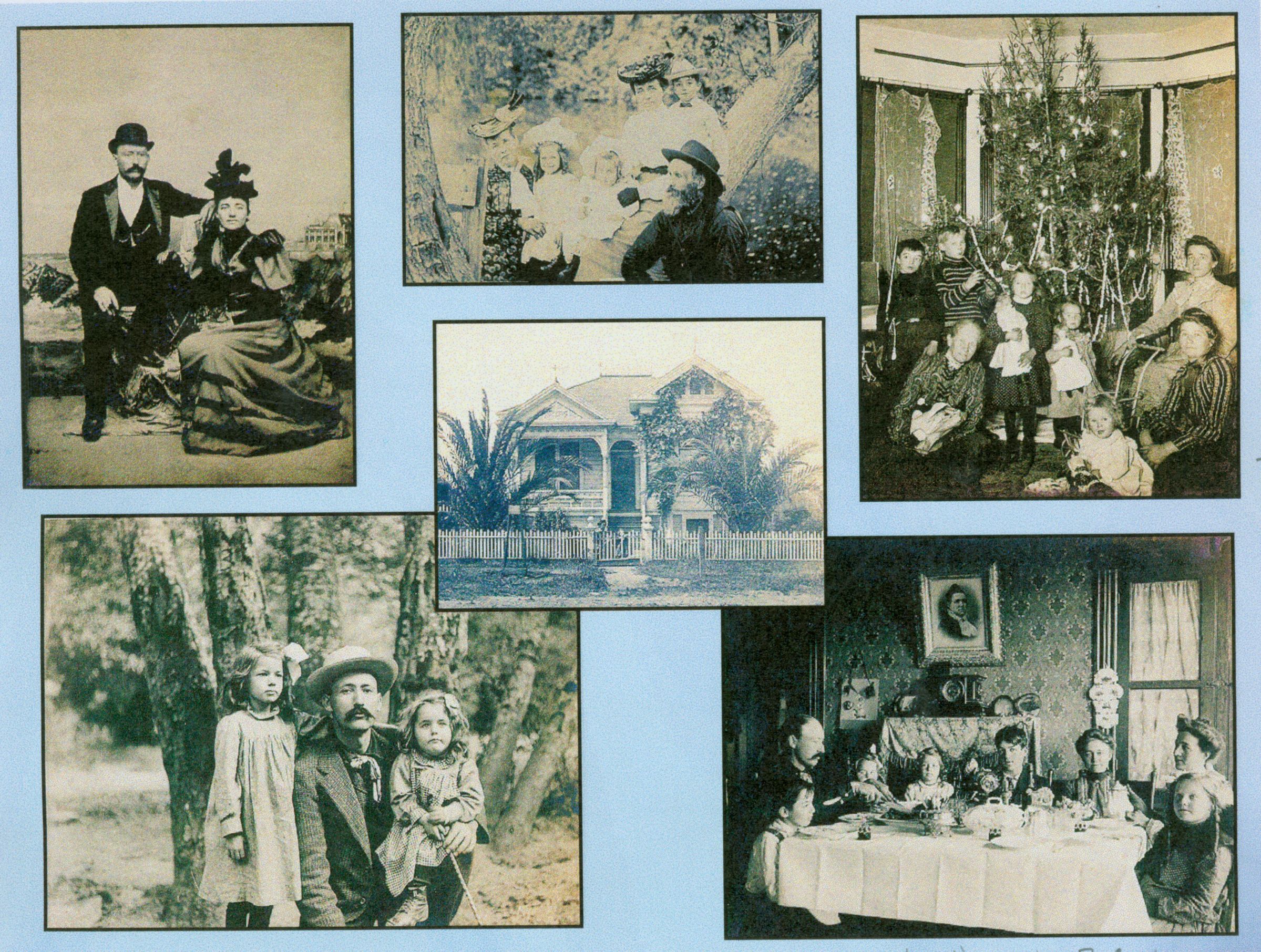 Starting in the upper left-hand corner and moving clockwise: this portrait of Zephyr (1857-1940) and Elizabeth (b. 1862) Gansburger Macabee was taken at Capitola, circa 1900; Elizabeth Macabee and her three young children are shown with Edward and Matilda Francis Macabee, Zephyr's parents; Christmas at 110 Loma Alta in Los Gatos; the dining room at 110 Loma Alta, with the Macabee family gathered around; and Zephyr Macabee with his two daughters, Lucile and Roma. In the center is the Macabee family home at 110 Loma Alta, also known as "the gopher trap house." MAC041Collection