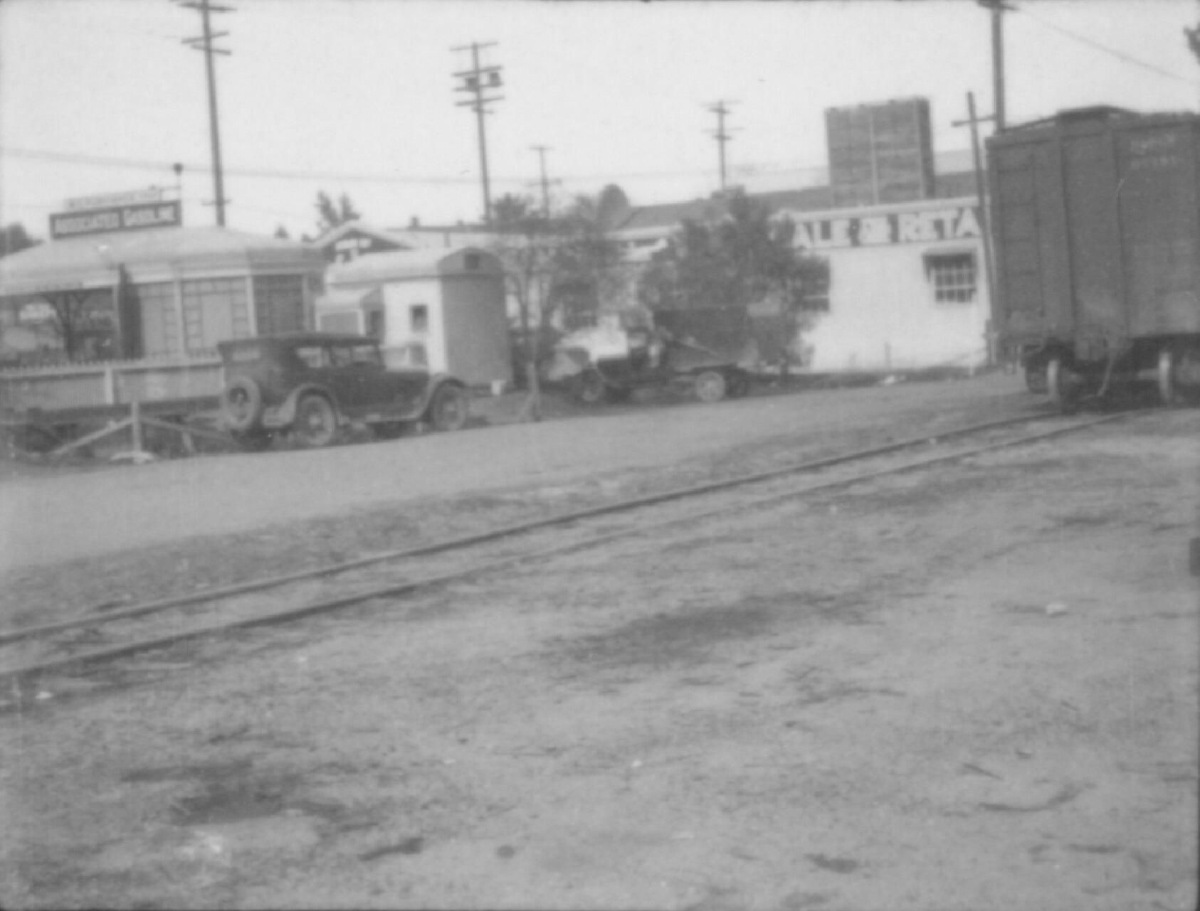 View of rear access to stores backing onto Southern Pacific Railway; tracks in foreground, with boxcar and automobile.Collection