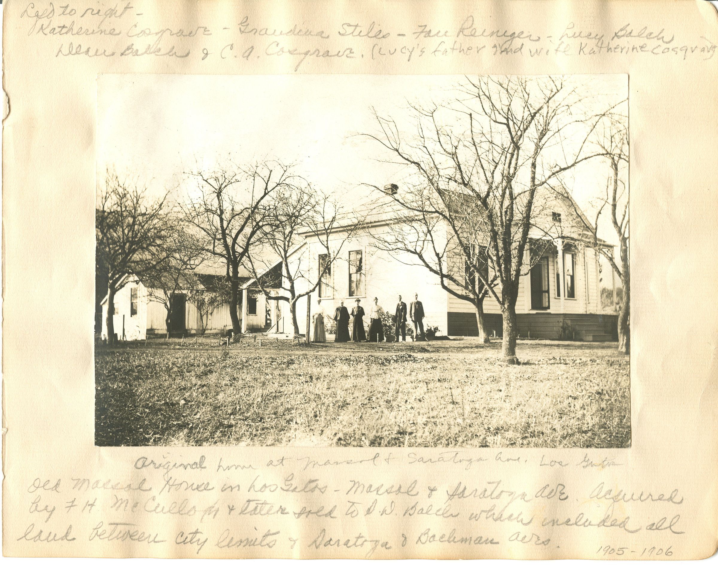 This is the original "Old Massol House," which sat near the corner of Massol and Saratoga Avenues. It was probably the home of Fen Massol, for whom the street is named. The house was acquired by F. H. Mc Cullough and later sold to Stevens Delos (Dean) Balch, who had it cut in two and moved across the street to be reconfigured into two separate cottages. Pictured left to right: Katherine Cosgrave, Grandma Stiles, Fan Reiniger, Lucy Balch, Dean Balch, C.A. Cosgrave. BAL002Collection
