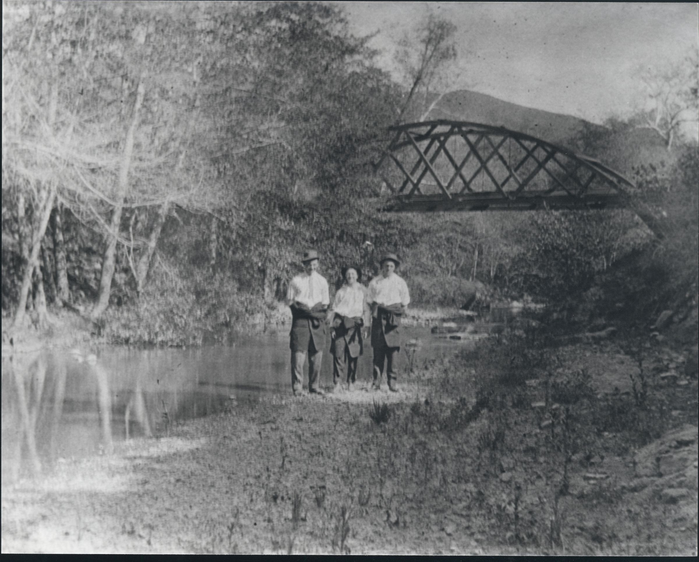 This image shows three fishermen just south of town, with a footbridge in the background. LGC017Collection